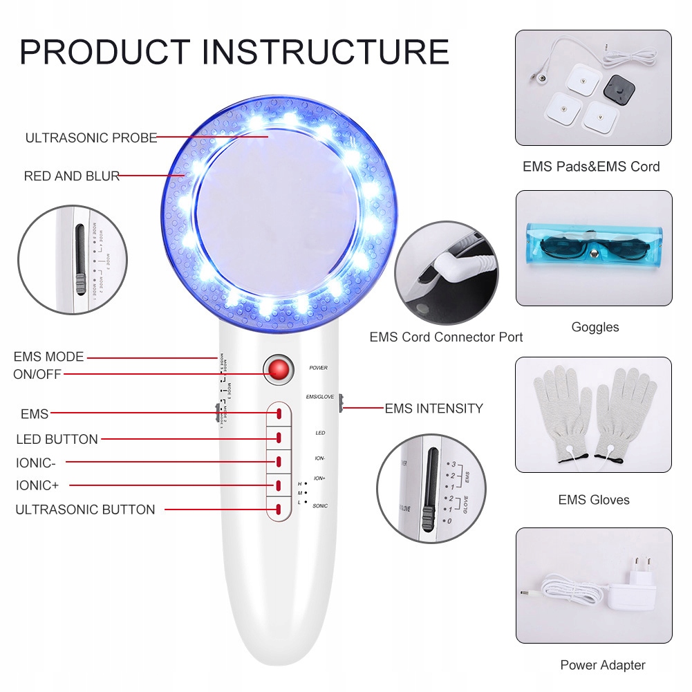 - Функциональный аппарат для похудения «6 в 1» имеет ультразвуковую функцию, функцию подачи положительных и отрицательных ионов, терапию красным светом, терапию синим светом и функцию стимуляции EMS, он может позаботиться о лечение проблем лица и похудение тела.