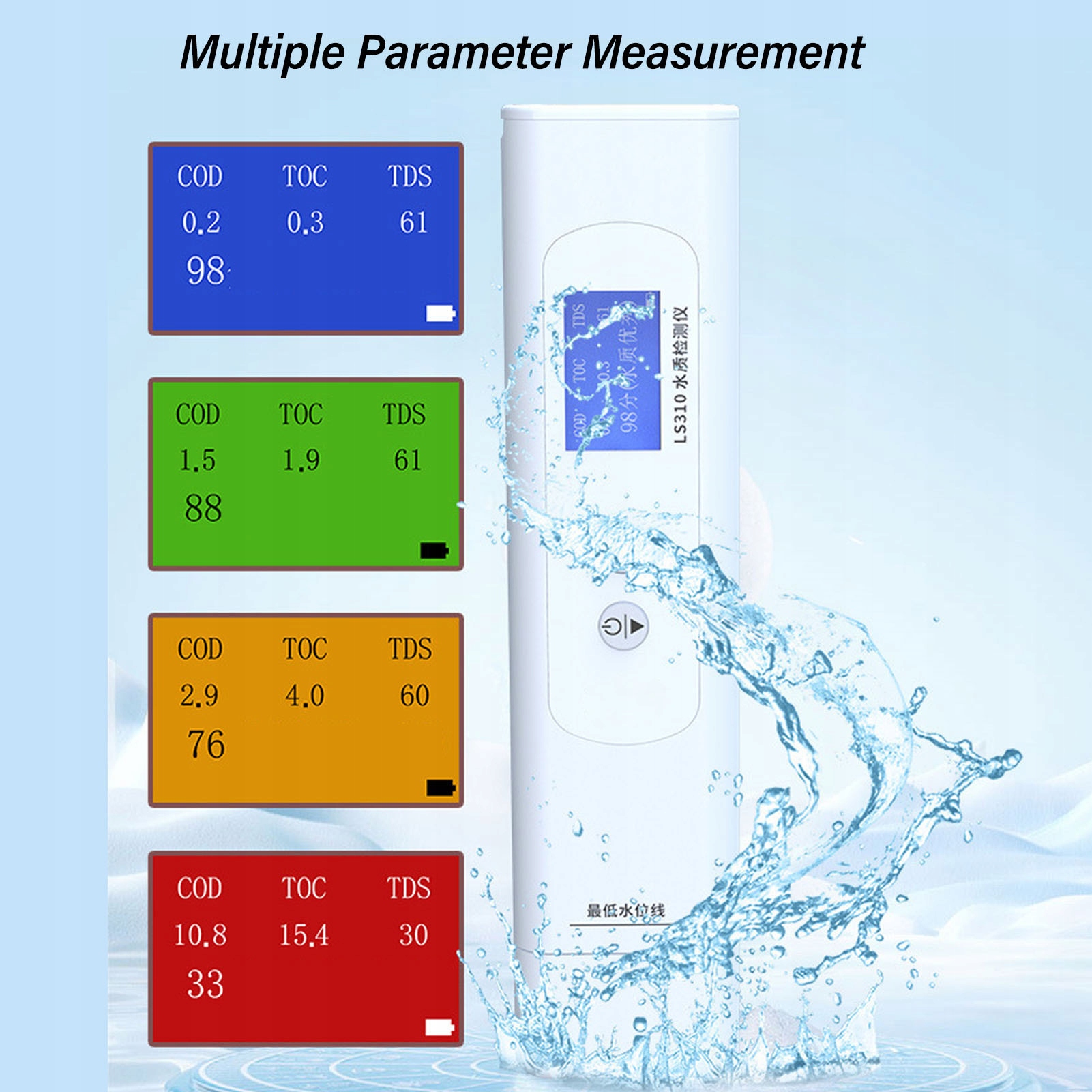 - Диапазон измерения: 0–100 мг/л для трески, 0–100 мг/л для TOC, 0–1,0 а.е./см для UV275, 0–2 000 ppm для TDS, 0–4 000 ед./см для проводимости, 0–50 ℃ для температуры.