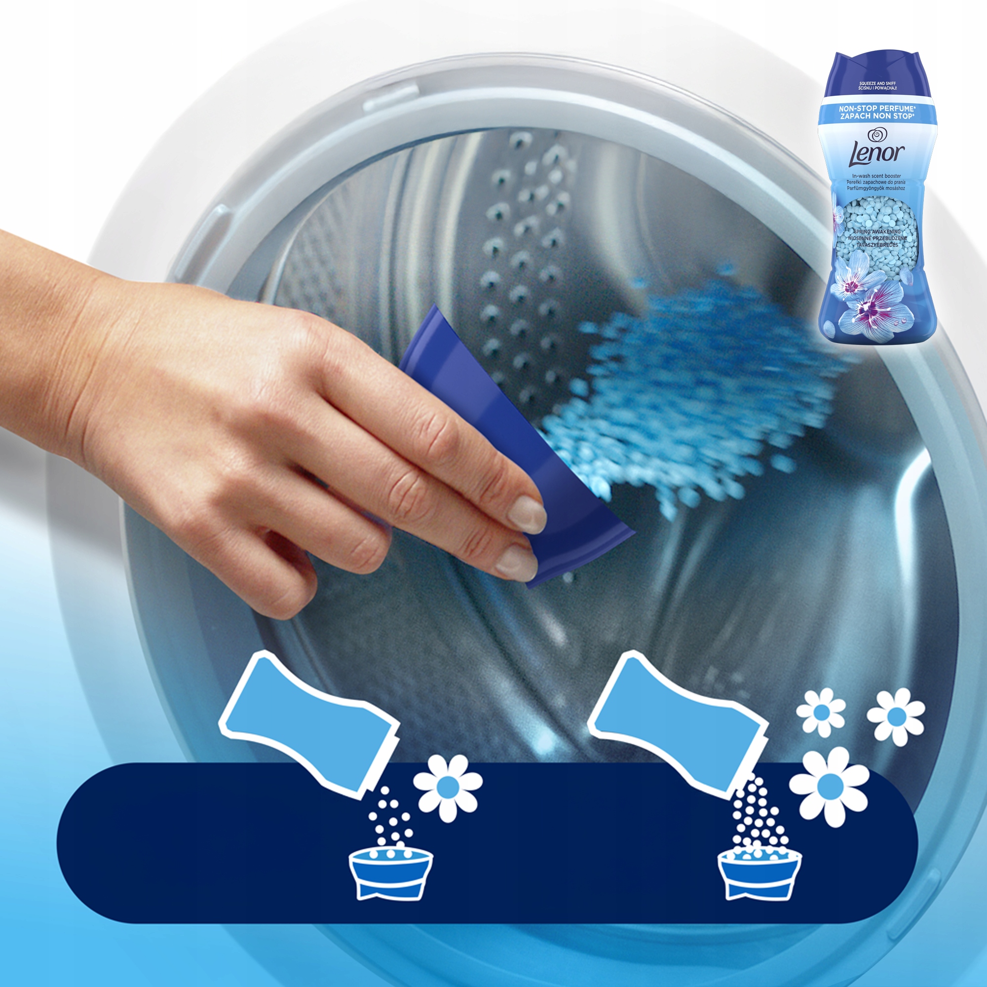 Откройте для себя ароматизированное духовое мыть жемчужины, которые обертывают одежду запахом весенних цветов, чтобы обеспечить им постоянную свежесть, до 12 недель в случае сохраненной одежды. Чистый запах, вдохновленный аккордами свежих цветов и теплой янтарной янтарь. Жемчужины Lenor Spring Awakening Aragrance были созданы для того, чтобы работать в идеальной гармонии с жидкостью для смягчения тканей Lenor Spring Awakening.