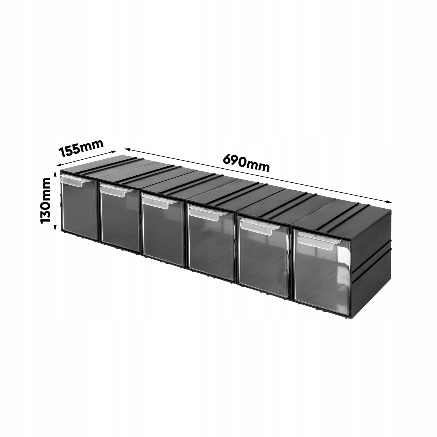 Пластиковый шкаф состоит из 6 прозрачных ящиков. Это идеальный способ хранения мелких элементов, шурупов, гаек, камней и т. д. Каждый из отдельных модулей можно соединить друг с другом с помощью специальных выступов в зависимости от потребностей. Конструкция шкафа изготовлена из ударопрочного материала.