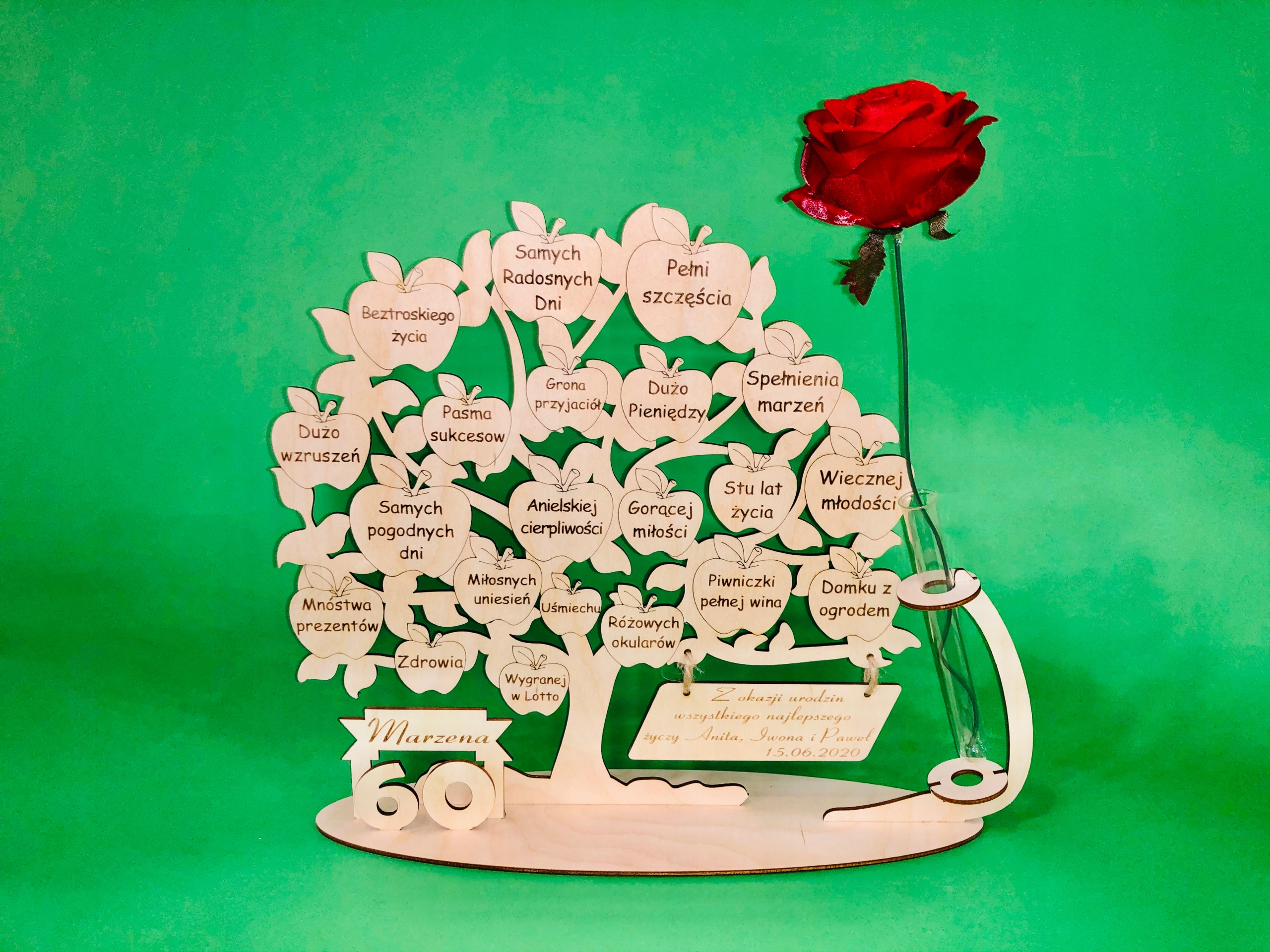 Красиво вырезанная фанера и гравированное дерево с пожеланиями имениннику.