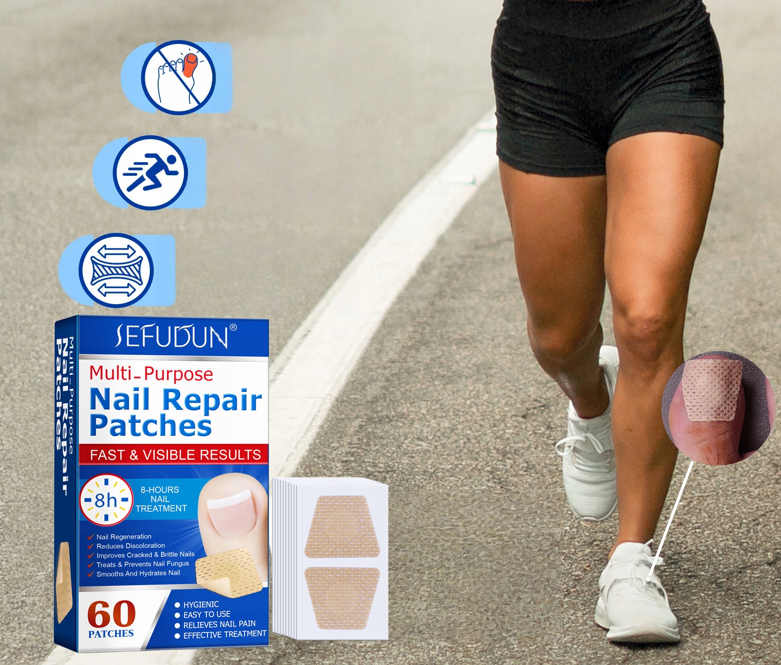 Эти пластыри представляют собой инновационную повязку для применения при лечении грибка ногтей. Повязка способствует быстрой реконструкции ногтя, его регенерации, а также уменьшению шелушения, выпадения или пожелтения ногтя.
