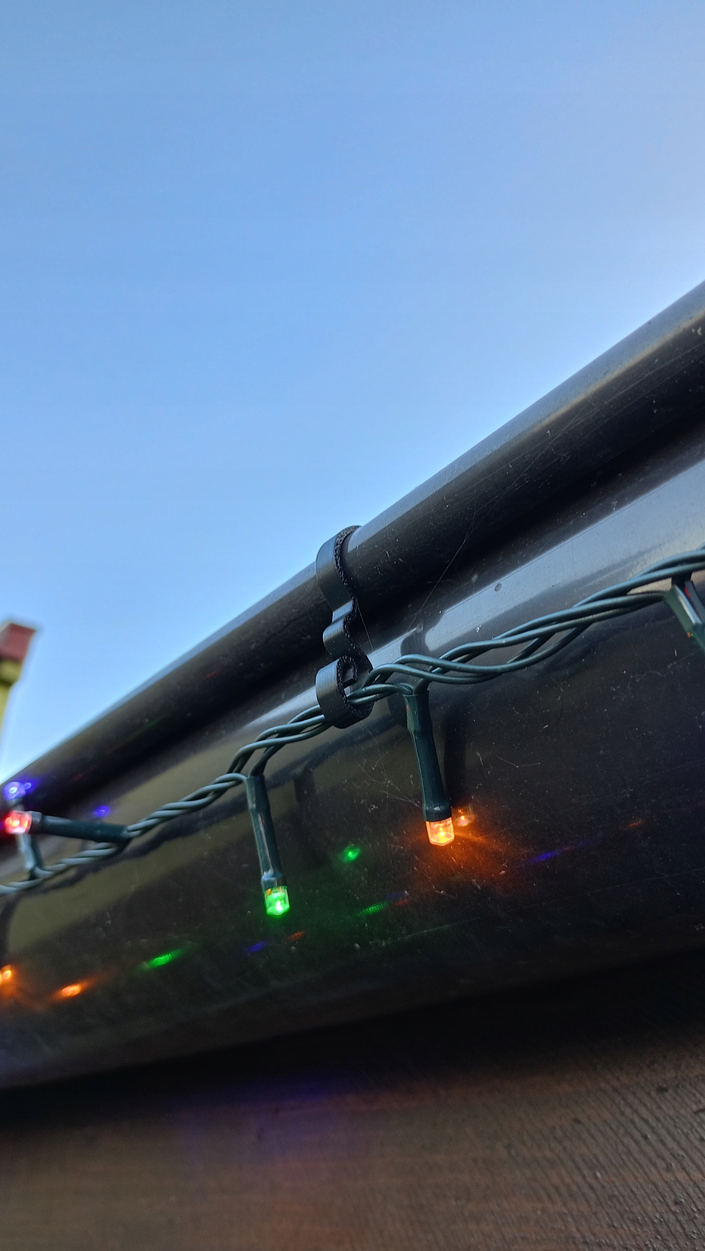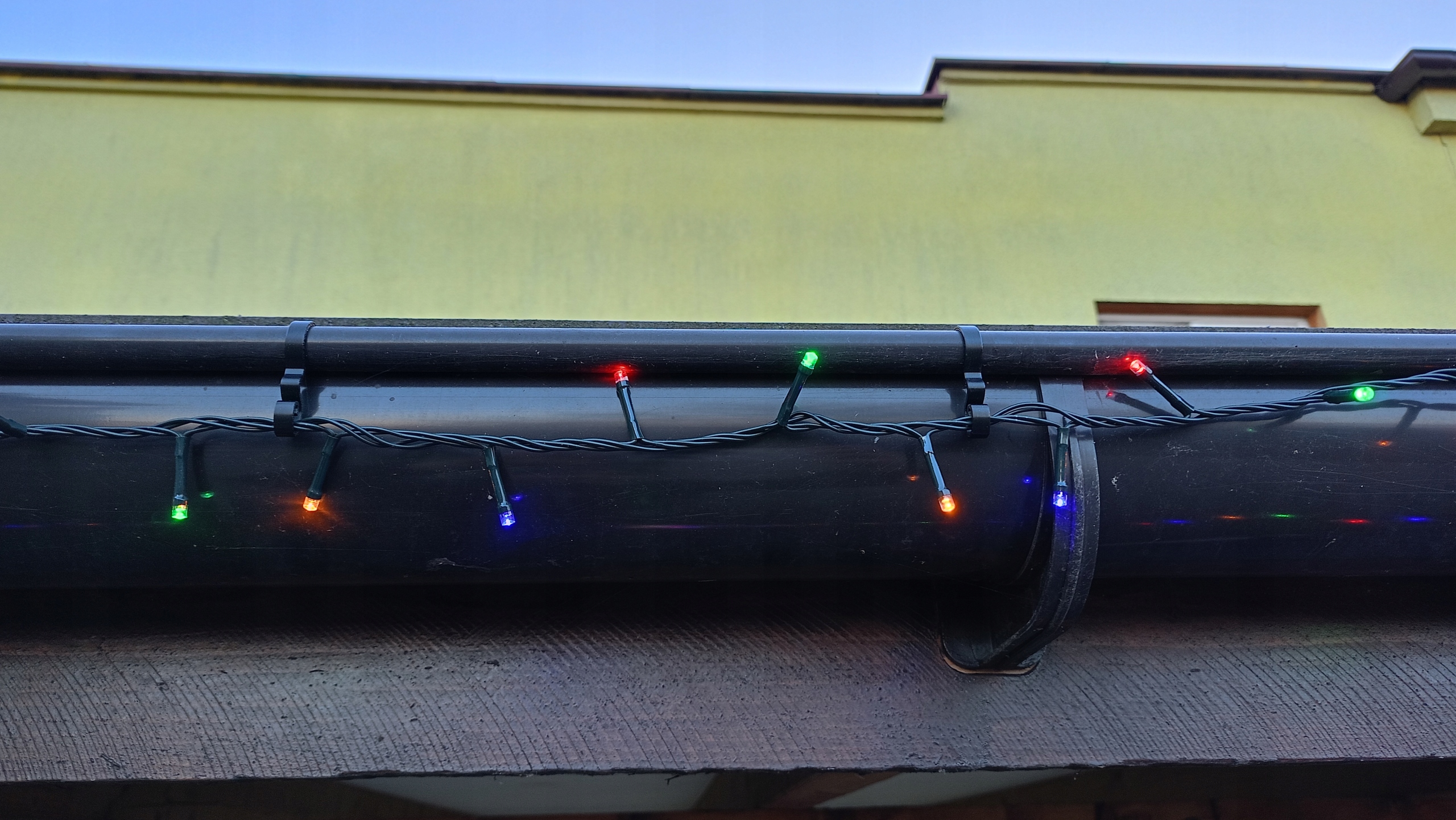 На первом этапе крючки можно разместить на цепочке светильников, а затем только прикрепить к желобам. Другой способ — сначала прикрепить крючки к желобу, а затем повесить рождественские гирлянды.