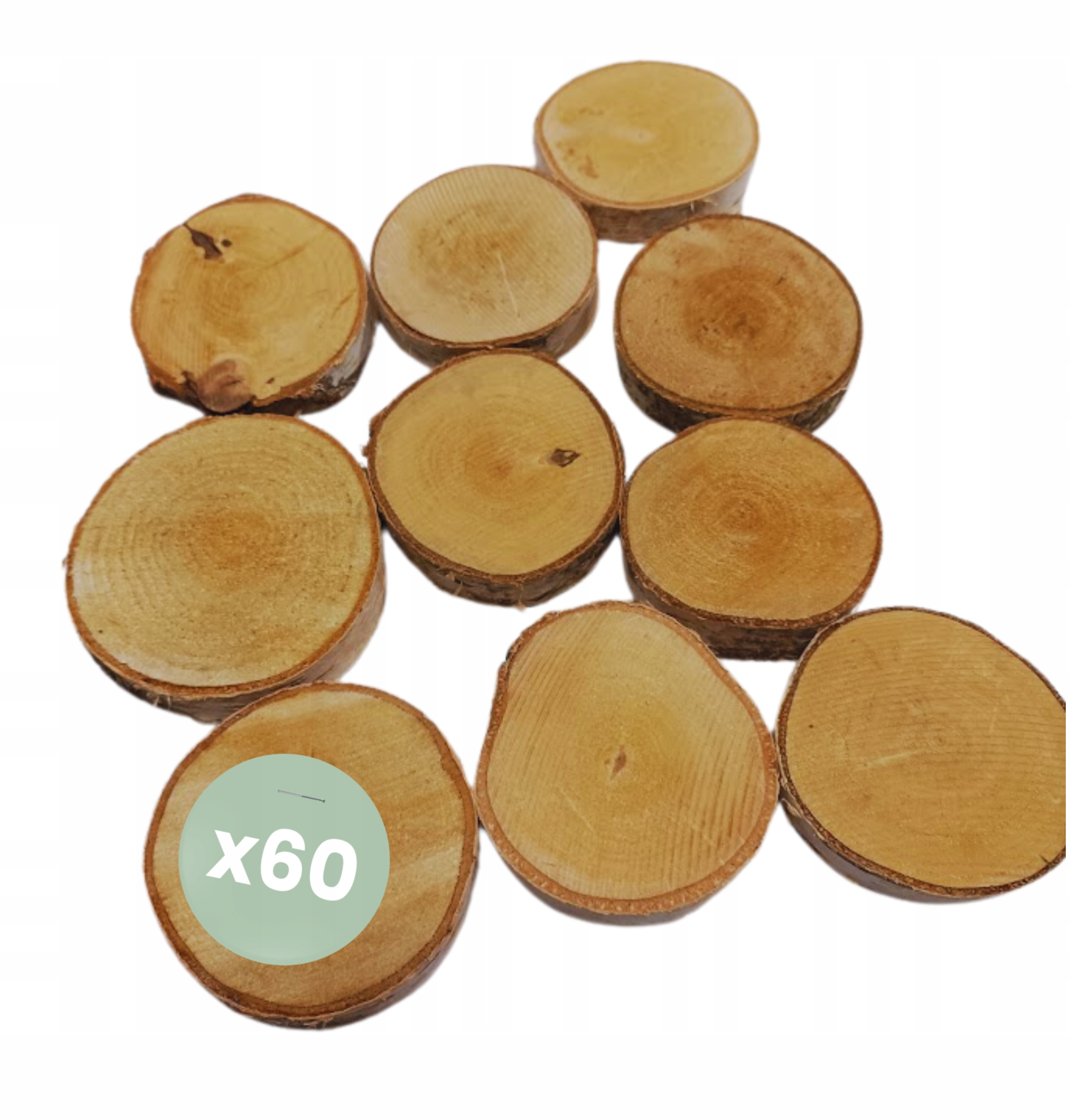 Продукт составляет 60 ломтиков березы диаметром от 8 до 10 см и толщиной около 2 см . Поверхность гладкая и очищенная , но бескнечная - благодаря этому дереву сохраняет свое уникальное очарование и текстуру . Уважаемый клиент - фото показывает продукт демонстративно - , поскольку это работа природы, каждая копия будет немного отличаться.