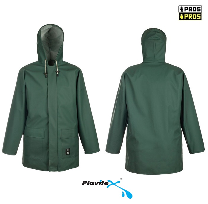 Куртка застегивается на молнию, прикрытую складкой. Имеет капюшон, ветрозащиту на рукавах и два боковых кармана. Модель изготовлена из водонепроницаемой ткани Плавитекс, предназначенной для использования в неблагоприятных погодных условиях. Обеспечивает эффективную защиту от ветра и дождя. Технология двусторонней сварки повышает прочность швов. Изделие соответствует стандартам европейских стандартов: EN ISO 13688 и EN 343.