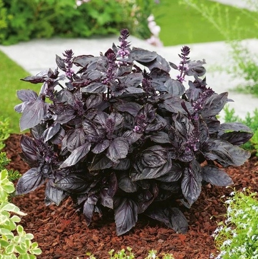 Базилик краснолистный (Ocimum basilicum purpurascens) — однолетнее растение с декоративными темно-фиолетовыми листьями и розовыми цветками