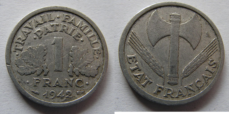6610. ФРАНЦИЯ-ВИШИ, 1 ФРАНК, 1942 год.