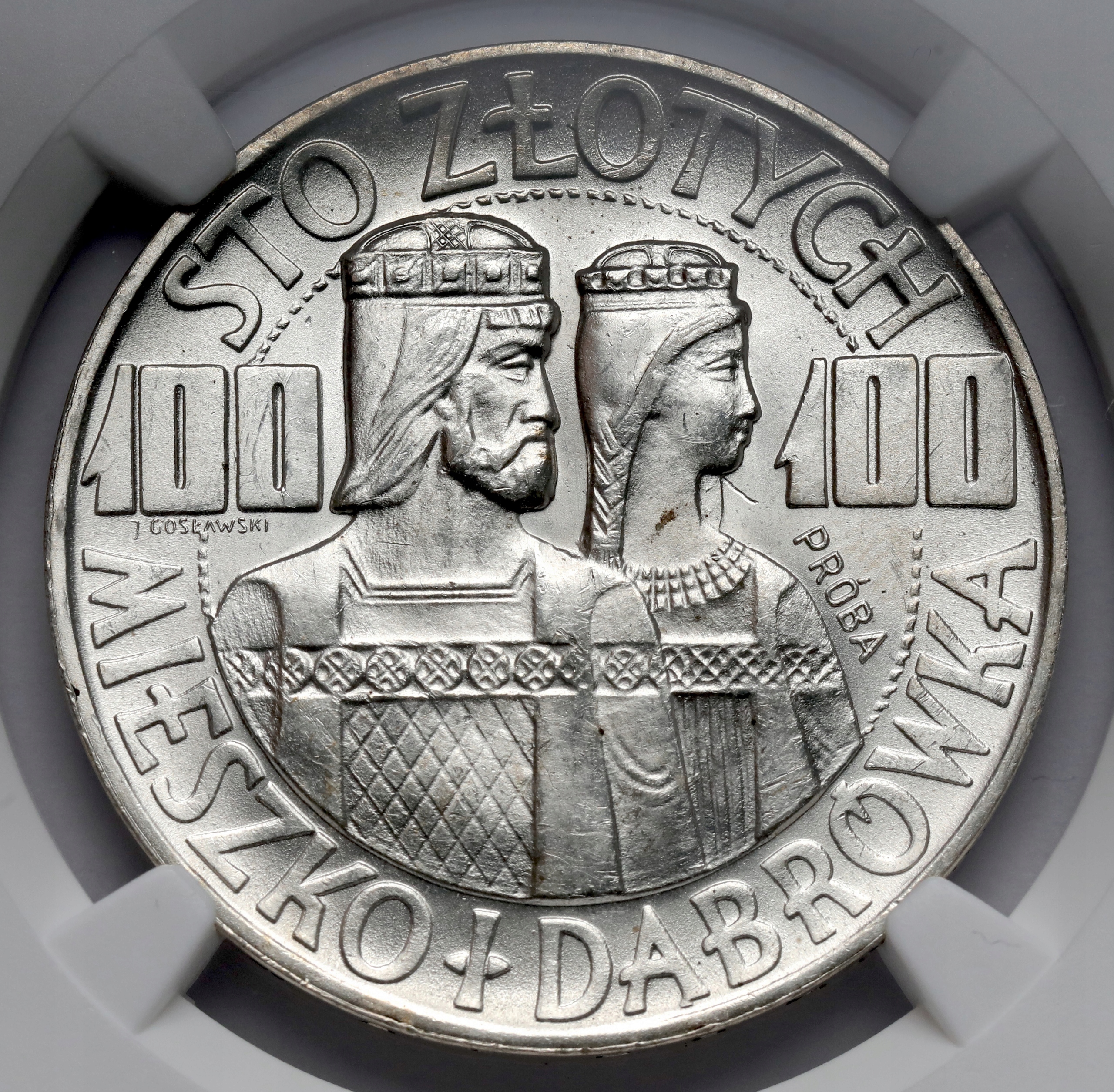 6713. СЕРЕБРО пруф, 100 злотых 1966 г. Мешко и Домбровка - полуфигуры - NGC MS66