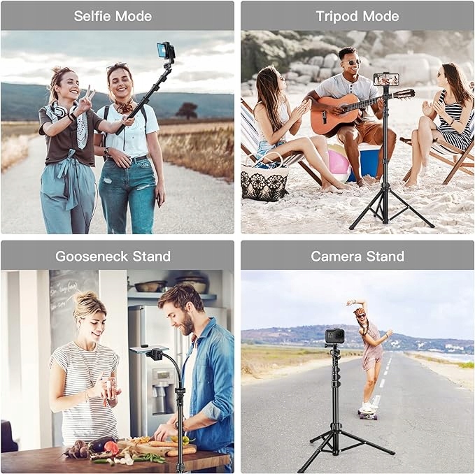 Удалите среднюю колонку, чтобы переключиться в режим палки для селфи. Держатель телефона, вращающийся на 360°, позволяет снимать под любым углом для профессиональной фотографии. Идеально подходит для селфи, групповых фотографий, видеоблогов и прямых трансляций.