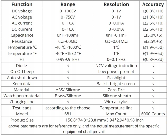 681 Pro - это продвинутый цифровой мультиметр бренда ангела, предназначенный для точных измерений и удобства использования. Благодаря истинной функции RMS, она обеспечивает точные измерения напряжения переменного тока (до 750 В), напряжения постоянного тока (до 1000 В), тока переменного тока/постоянного тока (до 10А), сопротивления (до 60 МОм), емкости до 100 мл), частоты (до 999,9 кГц) и температуры в диапазоне от -40 ° C до 1000 ° C. Бесконтактное обнаружение напряжения (NCV) и звуковая передача сигналов, повышайте безопасность и функциональность устройства.