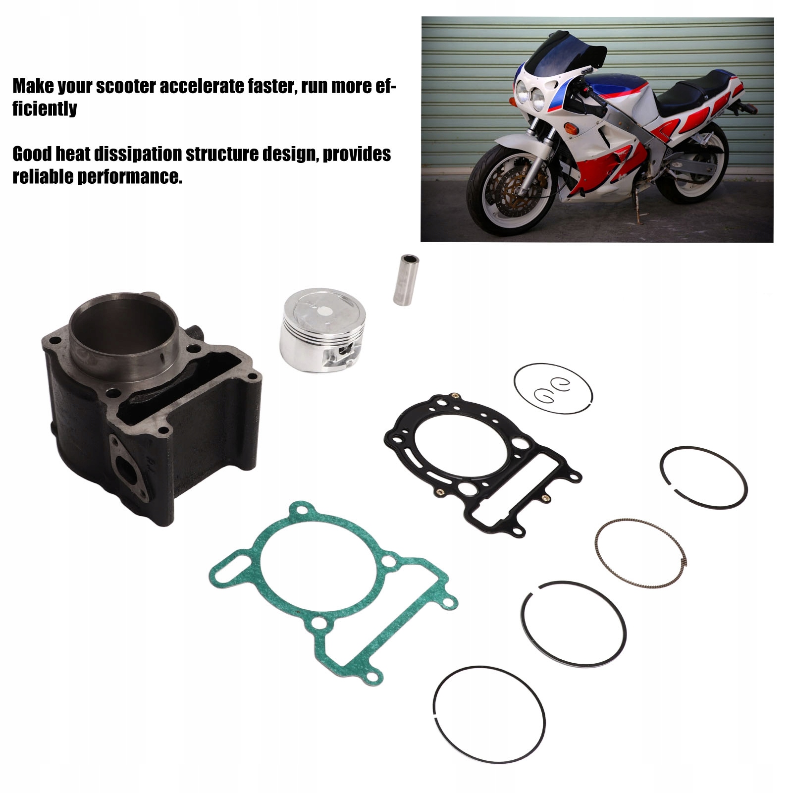 3. В комплект входит: В комплект входят 1 цилиндр, 2 прокладки, 2 зажима, 5 поршневых колец, 1 штифт, 1 шарнир, отличная замена вашему скутеру.