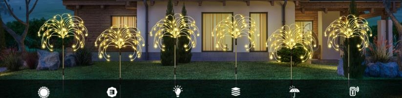 Фейерверки поставляются с пультом дистанционного управления, с помощью пульта дистанционного управления можно регулировать 4 уровня. яркости и 8 режимов мигания, установите время освещения на 3/5/8 часов, имеется функция автоматического обнаружения света в садовом светильнике, который автоматически заряжается на солнце в течение дня и автоматически загорается и мигает ночью.