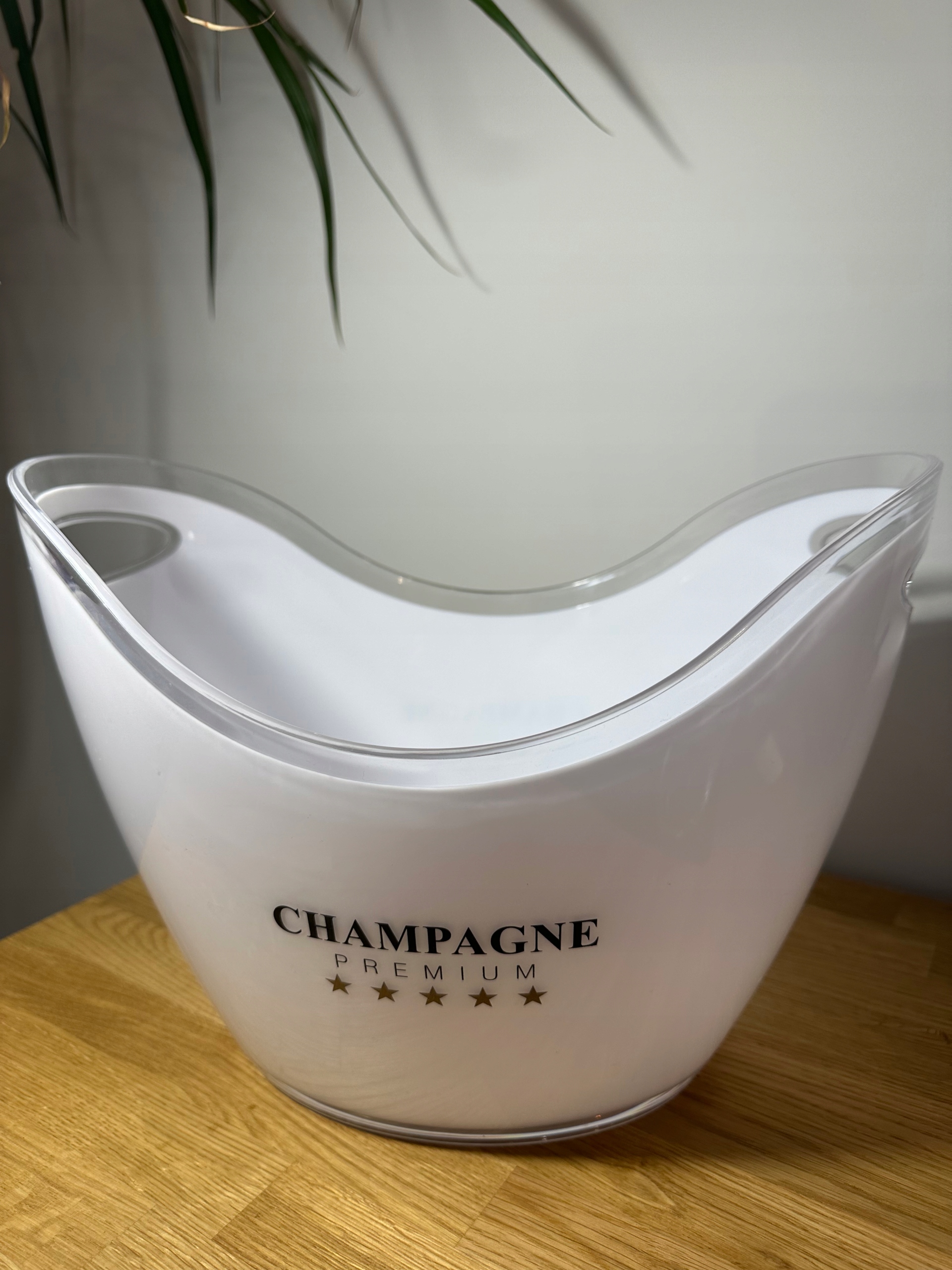 Если есть причина для празднования, шампанга не может пропустить. Широкая чашка пластикового шампанского имеет вместимость 6 л и предоставляет много места для льда и напитков. Белый контейнер с льдом с прозрачным краем, украшенный надписью премии с шампанским и 5 звезд. Благодаря двум ручкам, это портативное ведро для шампанского подходит для домашнего бара и сада.