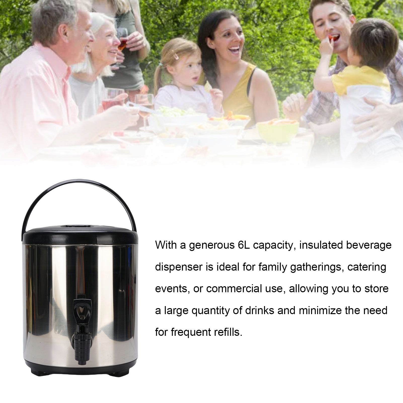 1. Просторная пропускная способность: с щедрой способностью 6L, диспенсер с изолированным напитком идеально подходит для семейных собраний, гастрономических или коммерческих событий, обеспечивая хранение большого количества напитков и минимизирует необходимость в частых добавках.