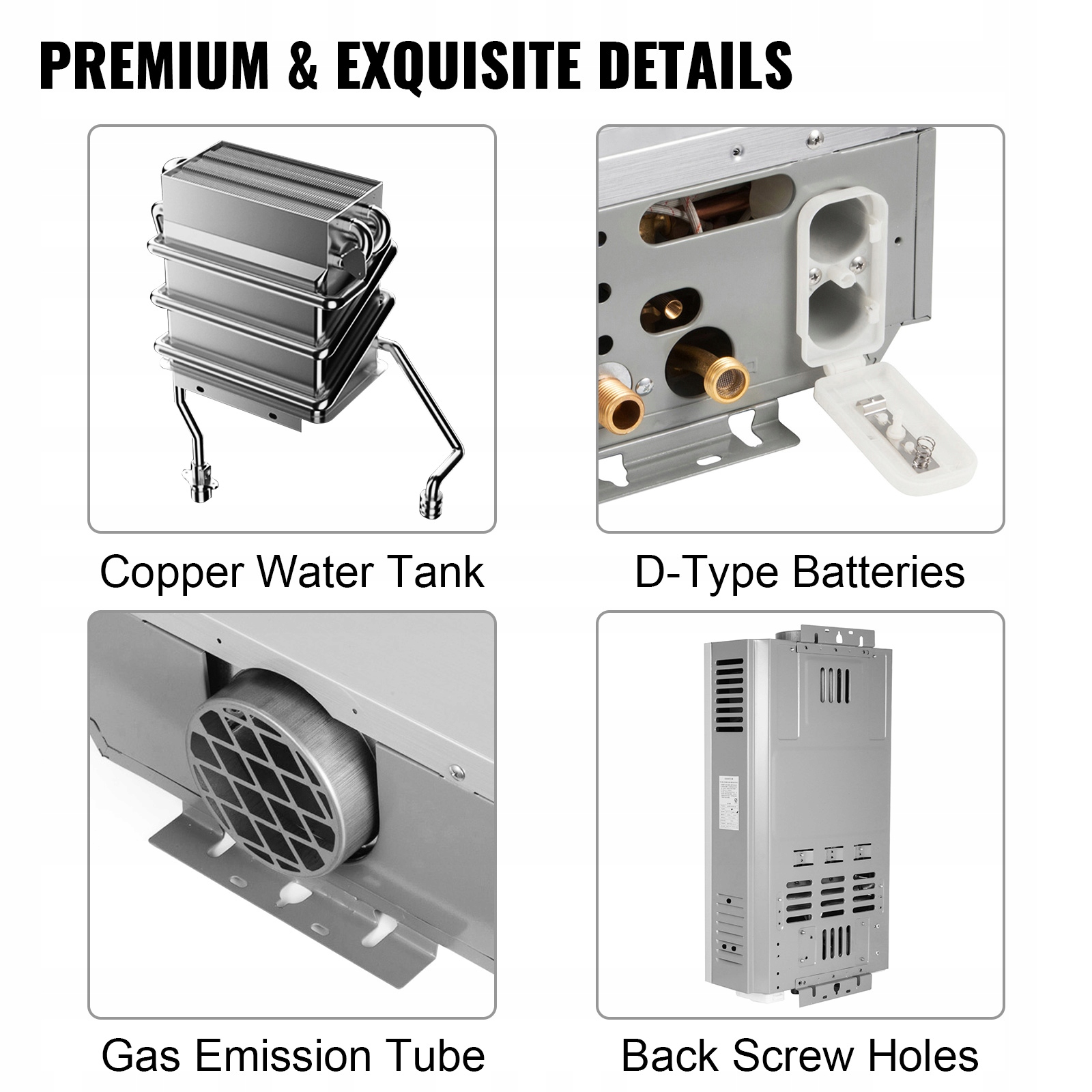 В этот продукт включены изысканные детали: фильтрующая сетка, медное впускное и выпускное соединение для воды g1/2 дюйма, газоотводная трубка, корпус смесителя d-типа и резервуар для воды из луженой меди для безопасного использования и долговечности.