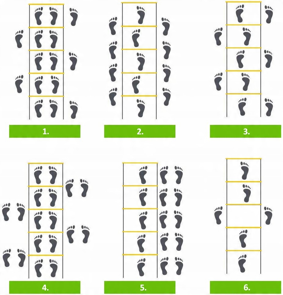 1. Две ноги вперед Прыжок на обеих ногах прямо через лестницу. Ваши ноги должны касаться земли после каждого шага. Постарайтесь постепенно сокращать время контакта ног с землей.