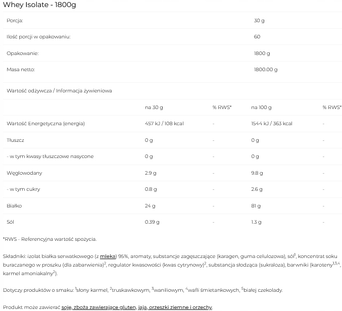 Сывороточный изолят — это продукт с высоким содержанием белка. Дополнение изысканное в каждой детали. Фантастическое сырье с очень высокой концентрацией белка. Он содержит почти следовые количества углеводов и жиров. Изолят сывороточного протеина (WPI) является одним из лучших источников очень быстро усваиваемых аминокислот – и по этой причине он является оптимальным выбором для употребления после тренировки, когда для полученных результатов важна каждая минута задержки. Стоит обратить внимание на очень высокое содержание аминокислот с разветвленной цепью BCAA и EAA, которые определяют быструю регенерацию и развитие мышечной ткани.