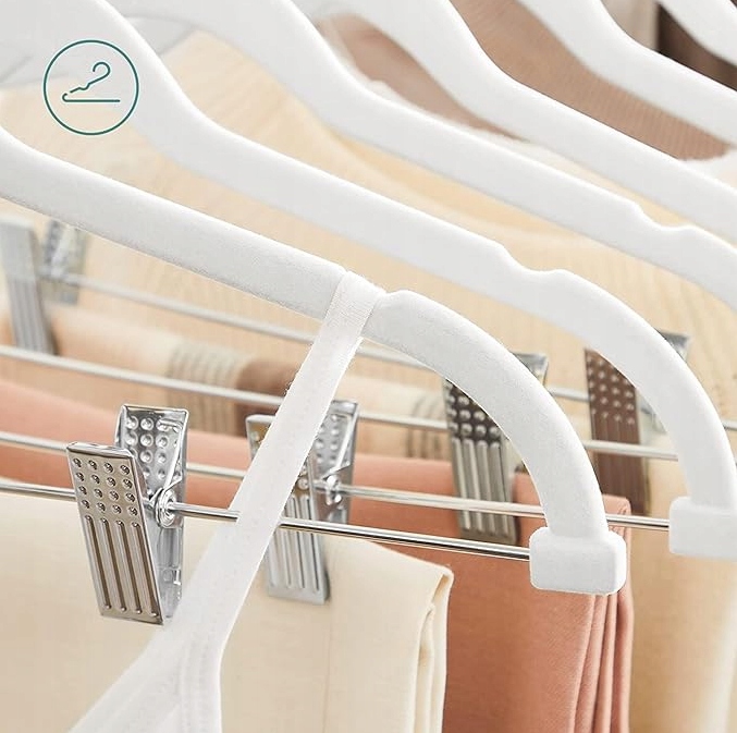 Покрытая бархатом поверхность высококачественной вешалки для костюмов предотвращает соскальзывание одежды. Благодаря двум боковым разрезам вы можете безопасно пристегивать майки, бюстгальтеры и т. д.