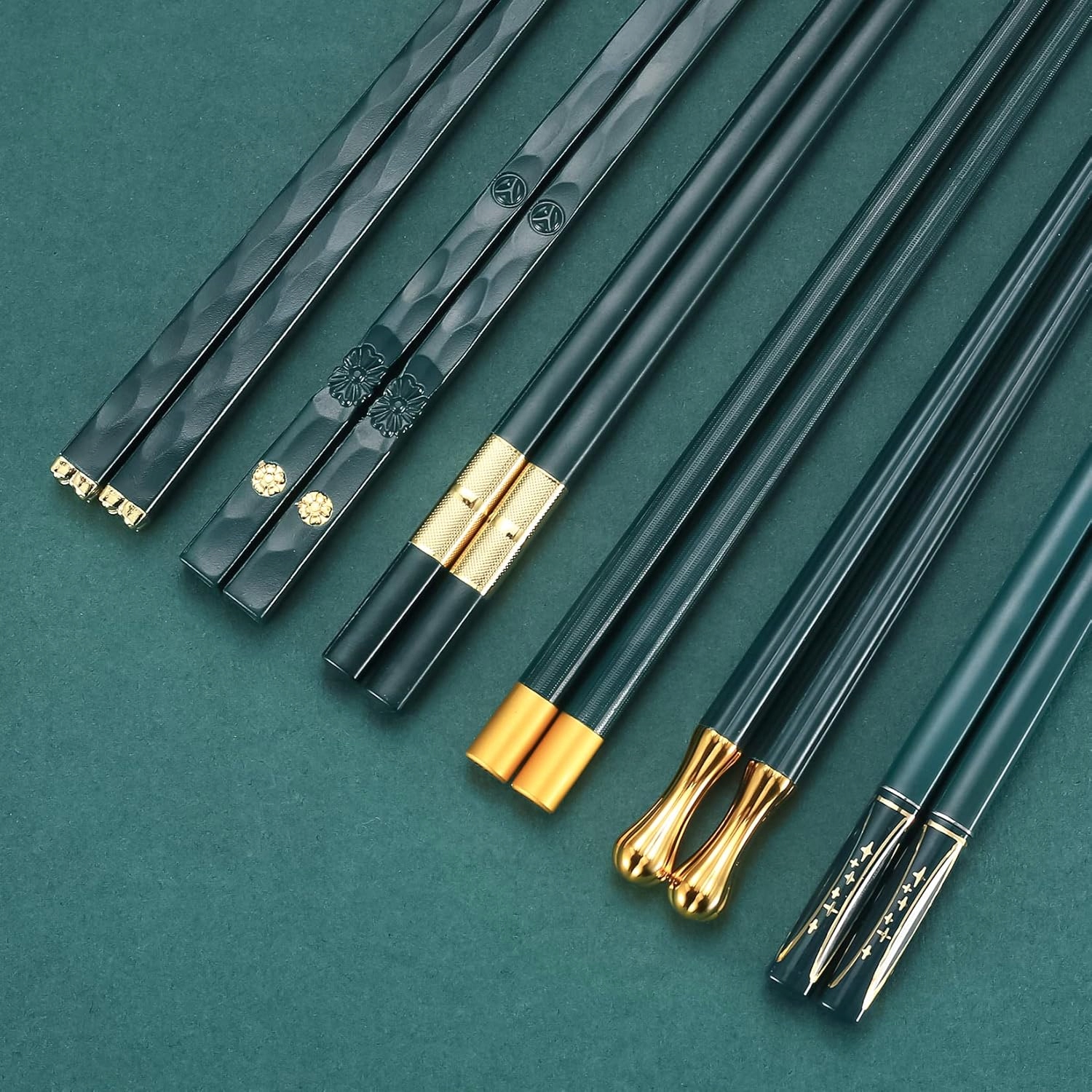Универсальный дизайн: палочки для еды украшены золотыми точечными узорами и изящными узорами на темно-зеленом корпусе палочек в строгом азиатском стиле. Хорошо сочетается с любой кухней ресторанного типа.