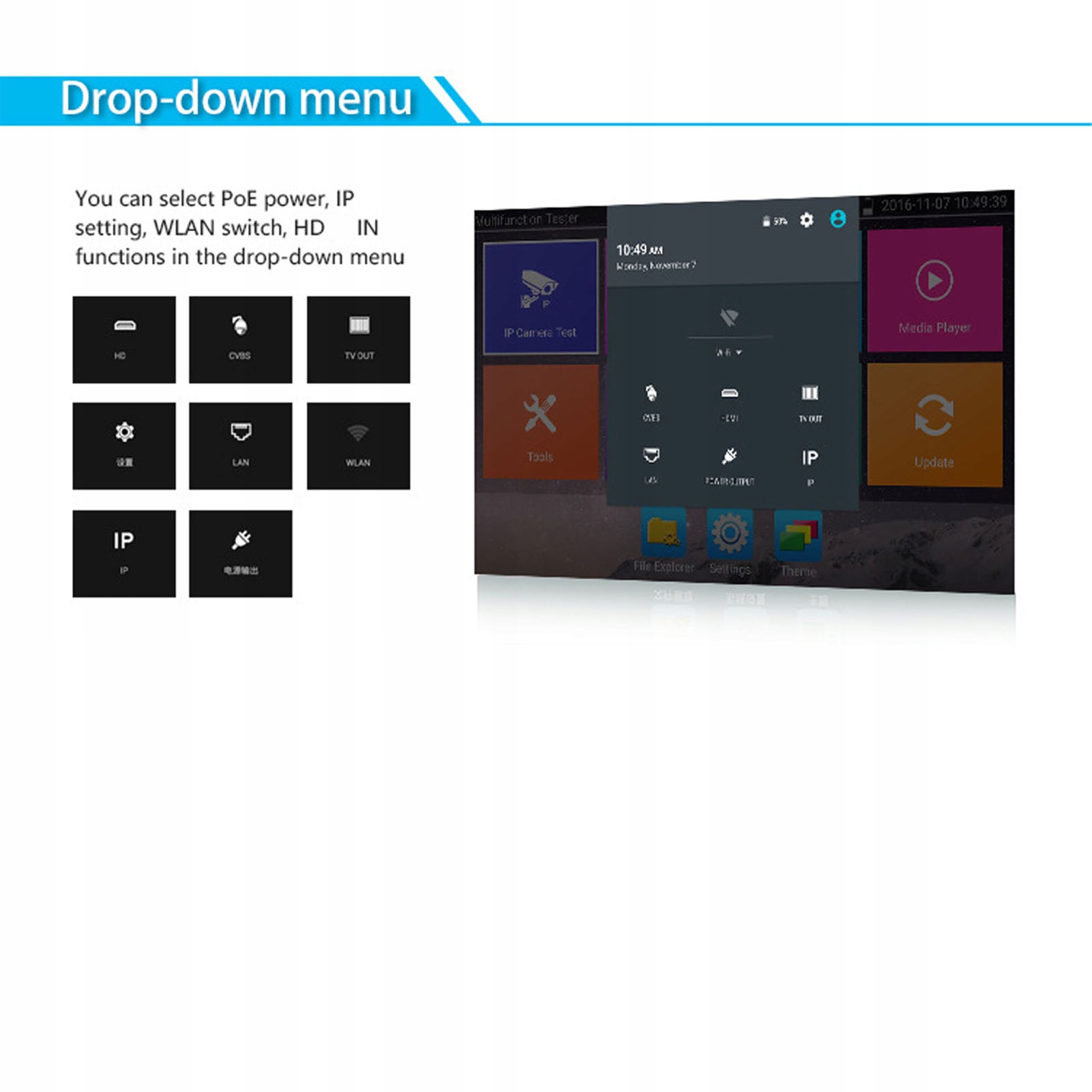 1. 7-дюймовый сенсорный экран: Наш тестировщик сетевого видеоролика-это 7-дюймовый сенсорный экран IPS, отображение видео 4K через дерьмовый ток, два сетевых порта 1000M, автоматическая адаптация 10, 100, 1000 м.