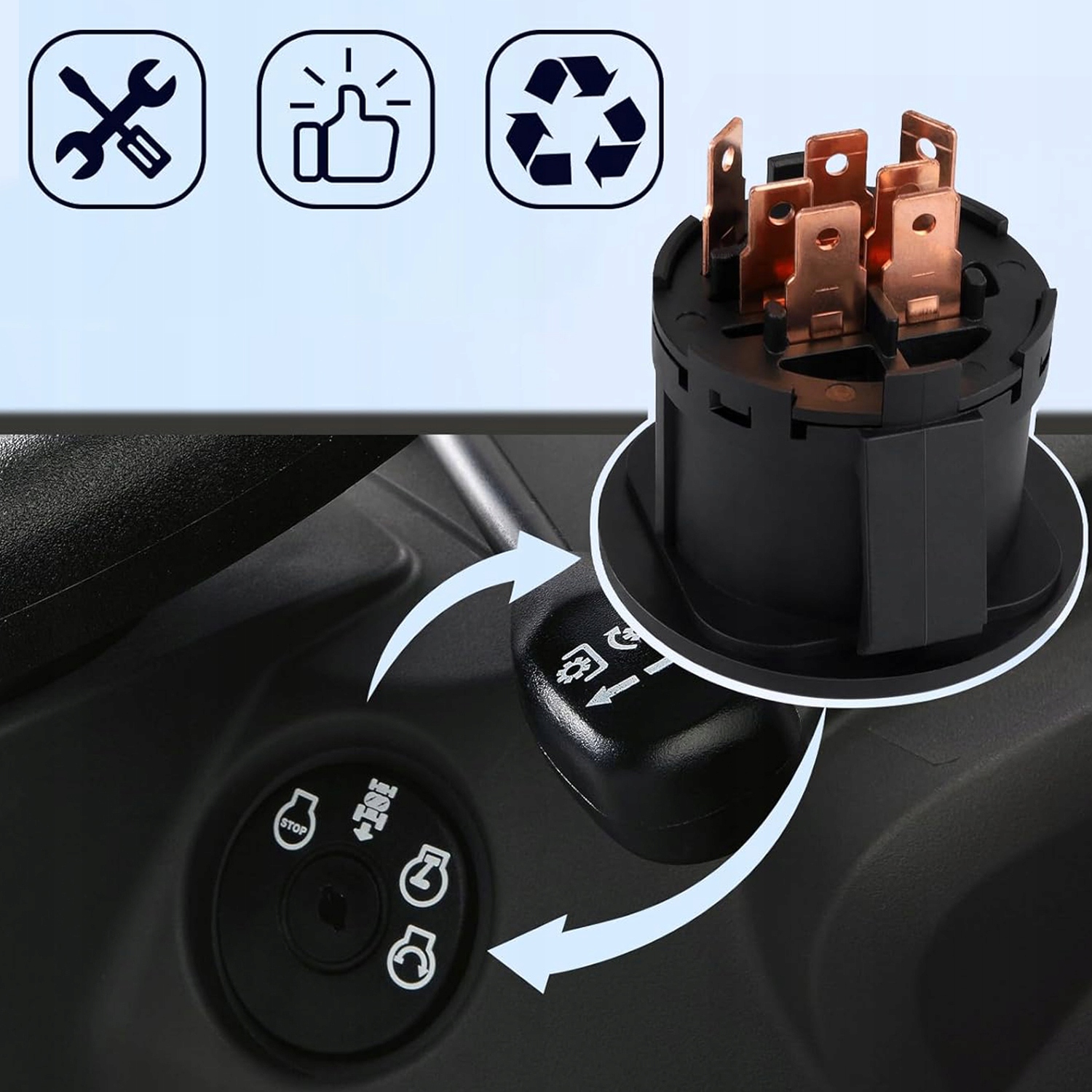 4 Функции: IM-Gate Showing Stoping. На задней части переключателя есть 7 соединений. Переключатель зажигания может решать такие проблемы, как запуск ошибок, что позволяет быстро перезапустить косилку с постоянной эффективностью и эффективностью. Отсоедините пробку, выжмите крюк на задней части переключателя и вытяните его. Подключите пробку к отверстию, подключите к новому выключателю и сдвиньте переключатель к отверстию, пока не услышите щелчок