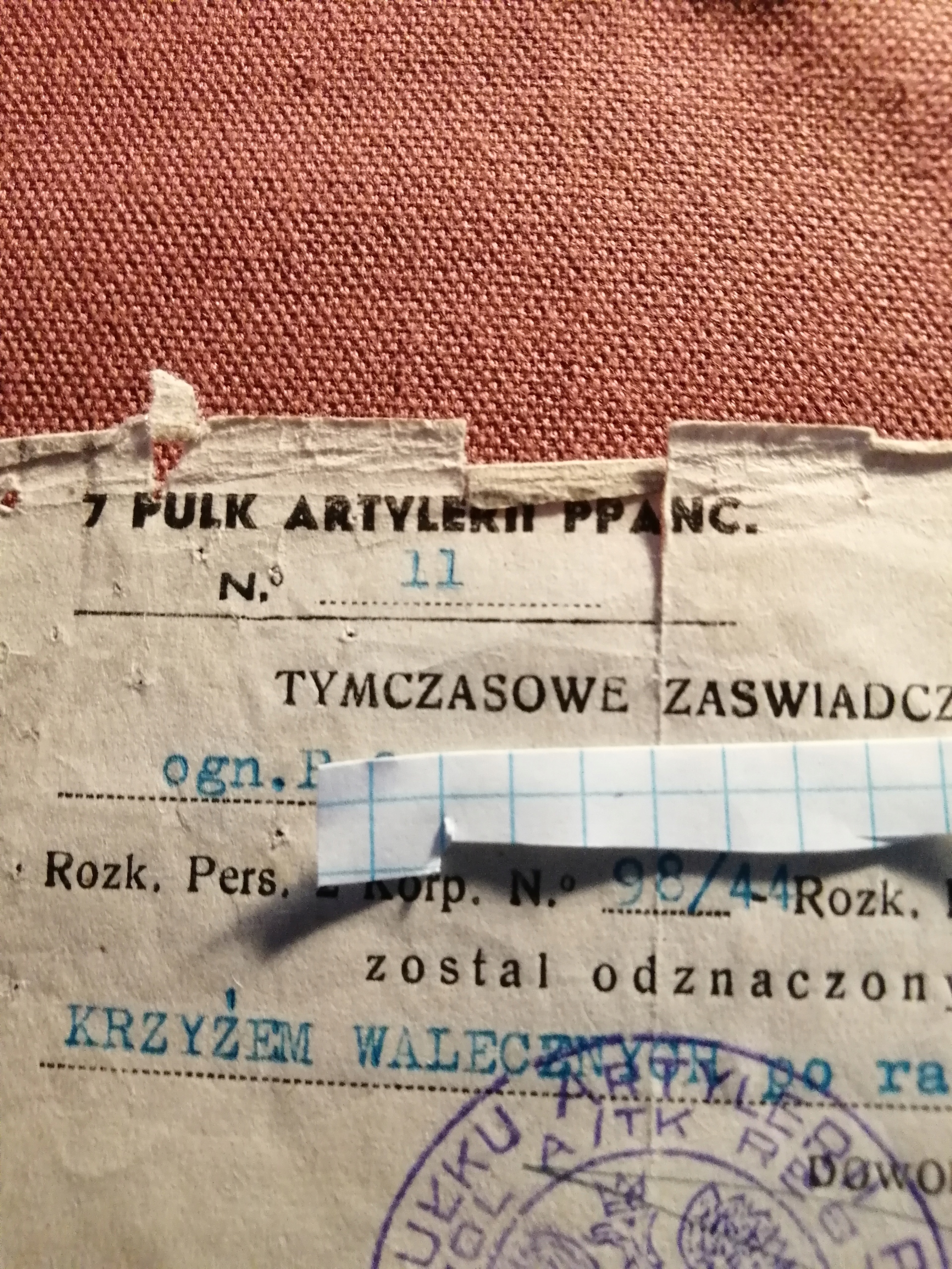 Оригинал. Временное свидетельство о предоставлении креста доблести впервые с Полк № 38/44. Видимая печать 7 -го рыболовного артиллерийского полка - 2 корпуса. Оригинальная подпись лейтенант Кол. Командиры полка Dowłega - Cieskowski.