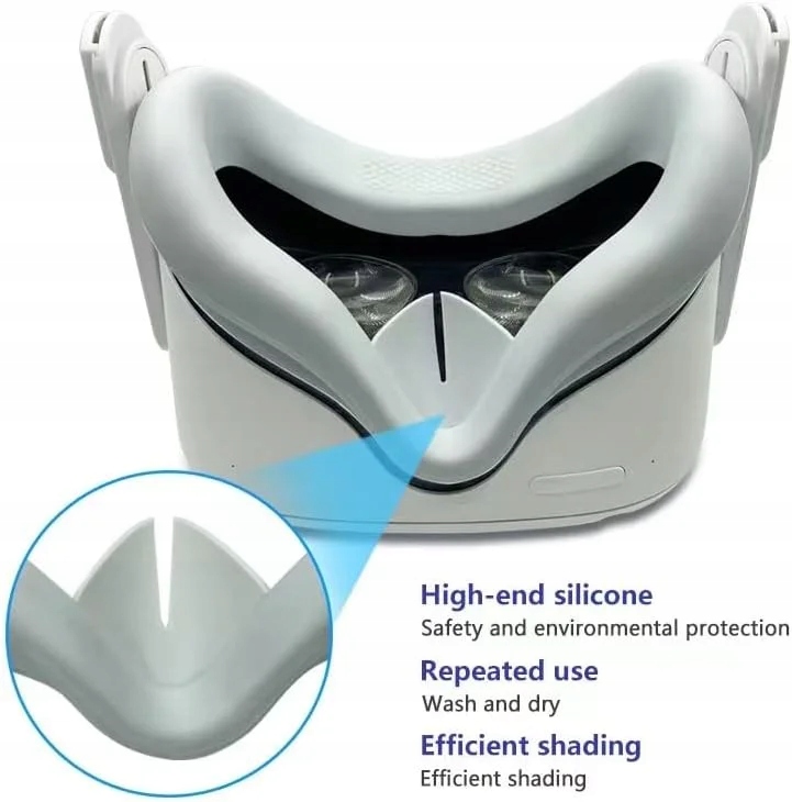 Лицевая крышка: изготовлена из полимерного силикона и имеет мягкую, гладкую текстуру, поглощающую давление лица; нет резкого запаха, можно использовать повторно; форма и размер разработаны в соответствии с контурами хозяина, идеально подходят к хозяину и лицу, не влияя на перспективу виртуальной реальности.