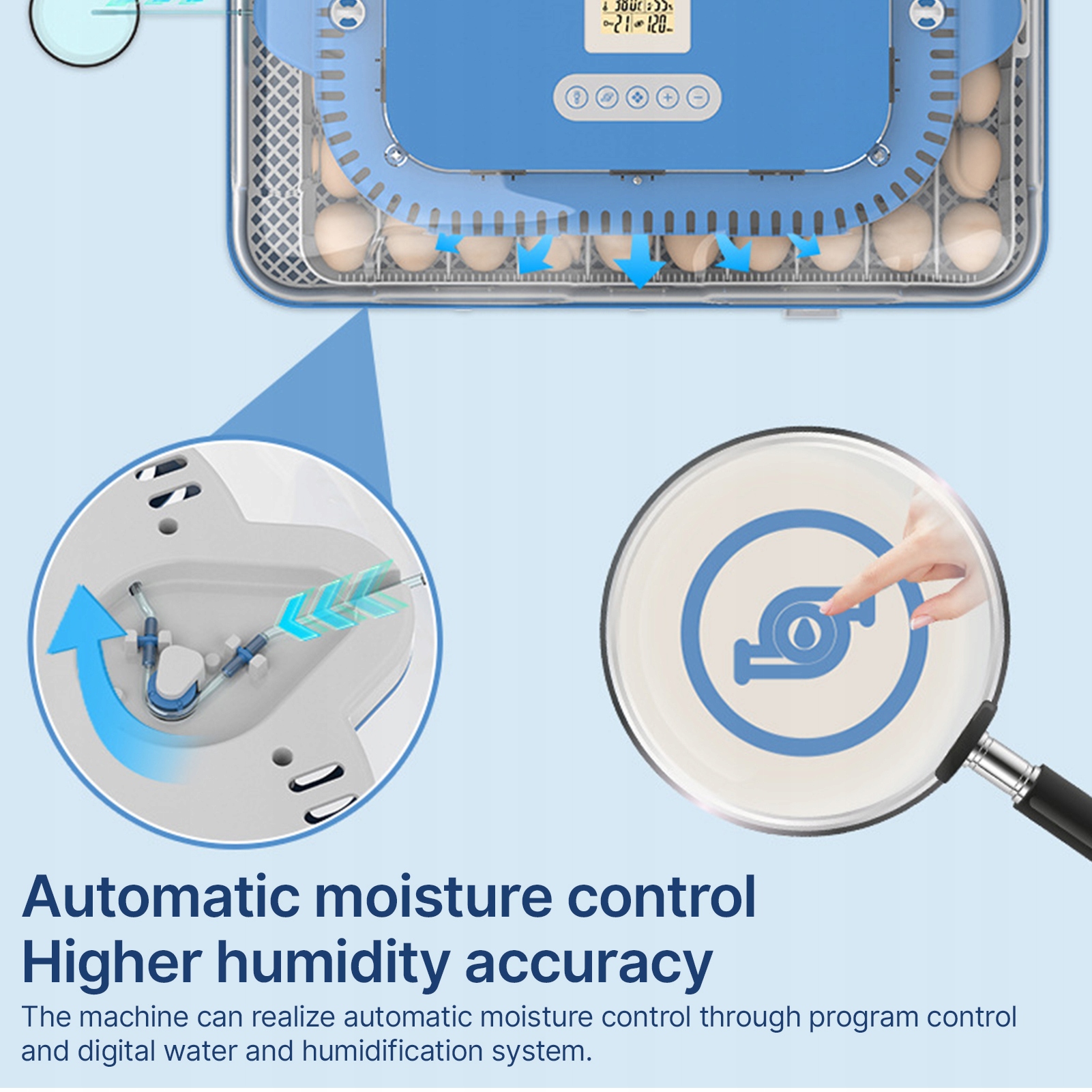 3. 【Автоматическое вращение яиц и контроль влажности】Горизонтальное скользящее автоматическое вращение яиц без застревания. Благодаря системе программного управления и цифровой системе пополнения и увлажнения воды, полностью автоматический контроль влажности.