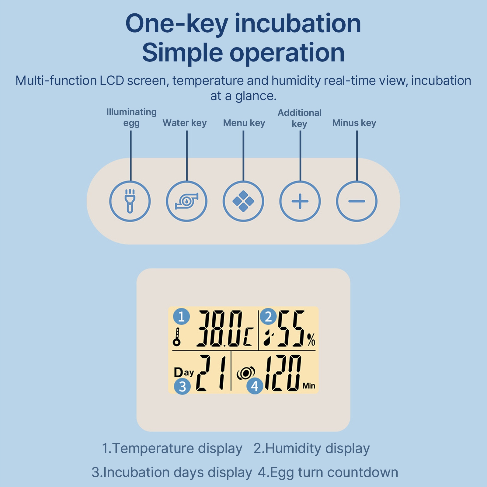 2. 【ЖК-экран и яйцо Candler】Инкубатор для яиц оснащен цифровым экраном и светодиодной подсветкой Candler. Монитор температуры и влажности в режиме реального времени, отображение дней инкубации, обратный отсчет поворота яиц. Легко контролировать и наблюдать за развитием яиц, не прерывая процесс инкубации.