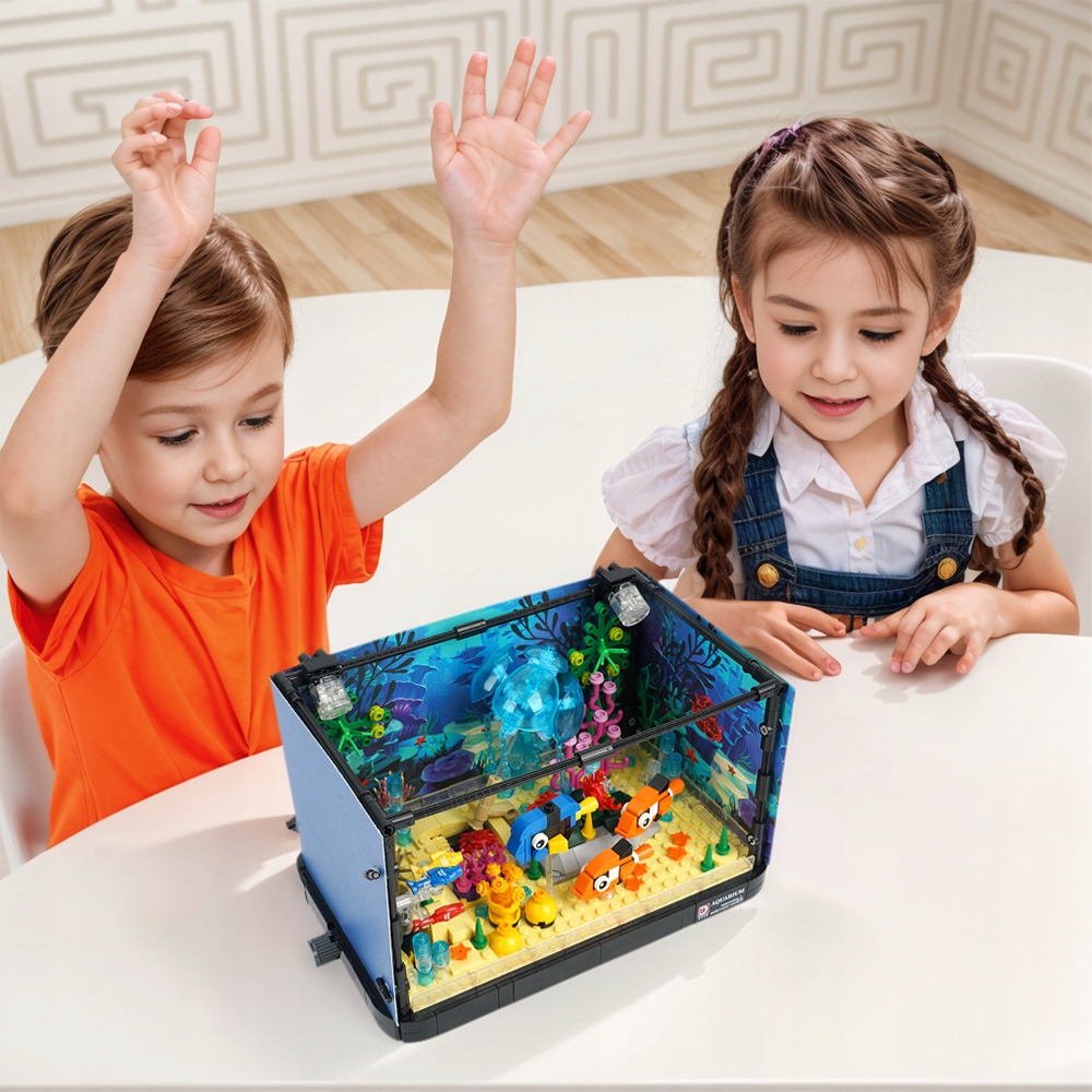 В этот набор для сборки аквариума входят разнообразные милые морские животные и растения, в том числе гигантская медуза, маленькая рыбка и различные водные растения. Сбоку аквариума имеется вращающаяся кнопка. Поворот кнопки перемещает медузу и рыбу. Съемные обои с океаном добавят аквариуму ярких красок. В комплект входят два сценических светильника, которые можно подсветить, чтобы создать эффект мечтательного или даже темного аквариума.