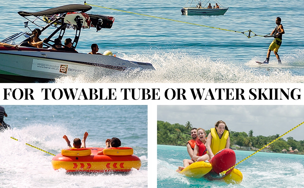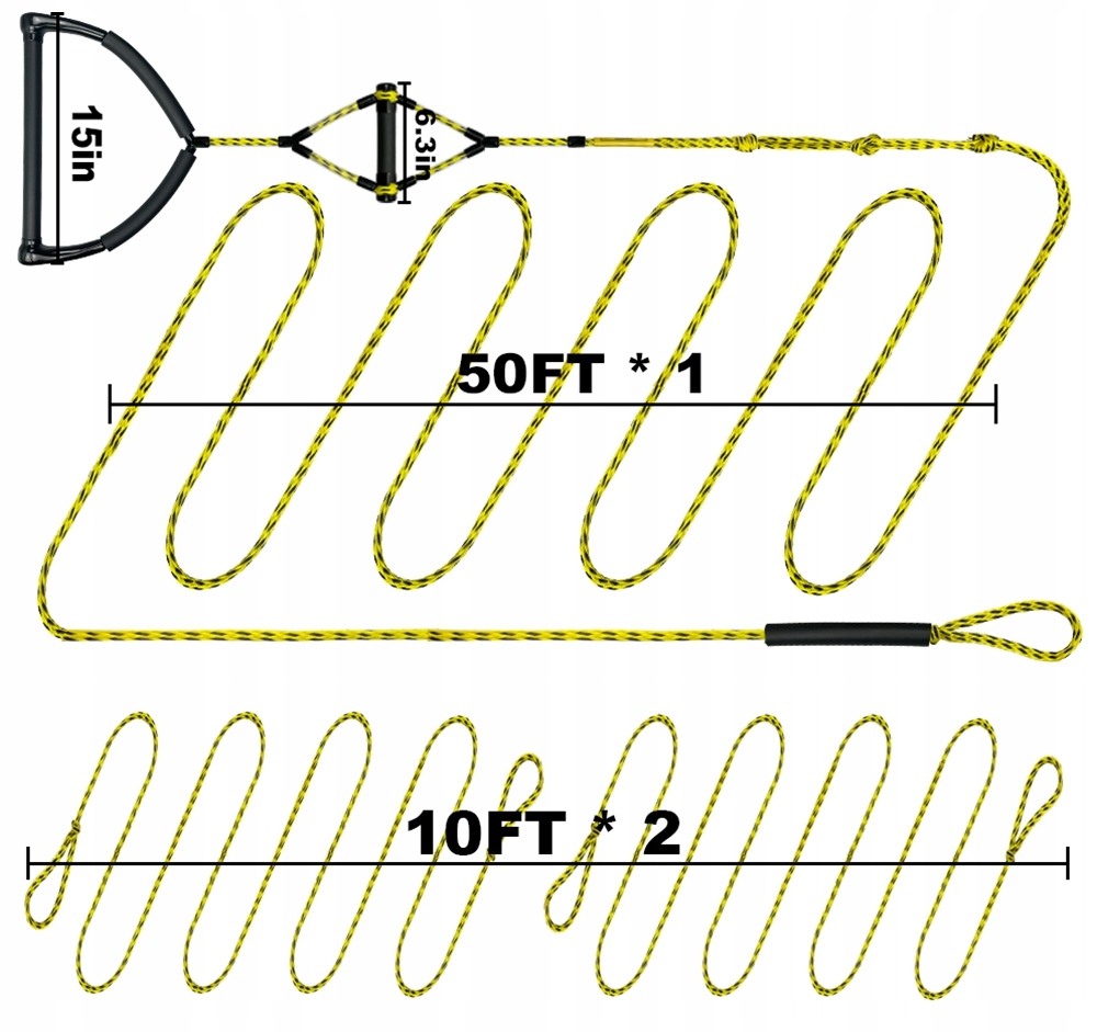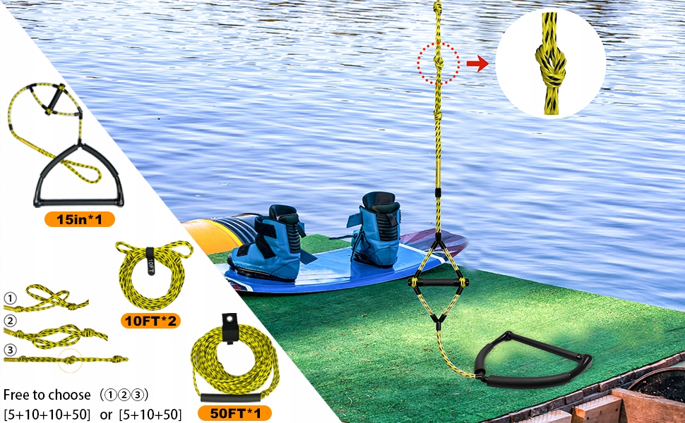 【РЕГУЛИРУЕМАЯ ДЛИНА】Общая длина нашей веревки для водных лыж составляет 75 футов, что составляет комбинацию 5 футов. рукоятка поводьев * 1, 10 футов стартовой веревки * 2, 50 футов стартовой веревки * 1