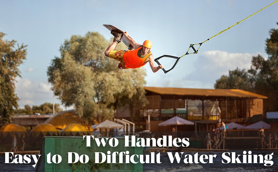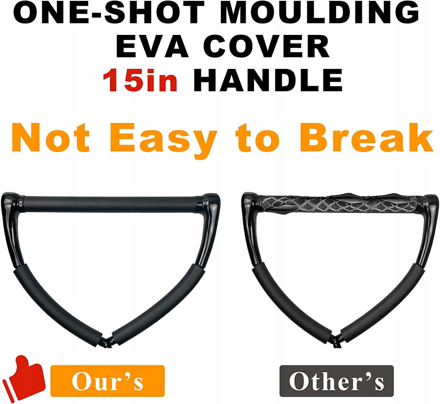 【СПЕЦИАЛЬНАЯ ДВОЙНАЯ РУЧКА】15-дюймовая усиленная ручка, которую нелегко сломать или упасть, как обычный материал ПВХ; Ручка длиной 6,3 дюйма обеспечивает дополнительную поддержку ваших навыков вращения и инверсии для выполнения сложных трюков на водных лыжах;