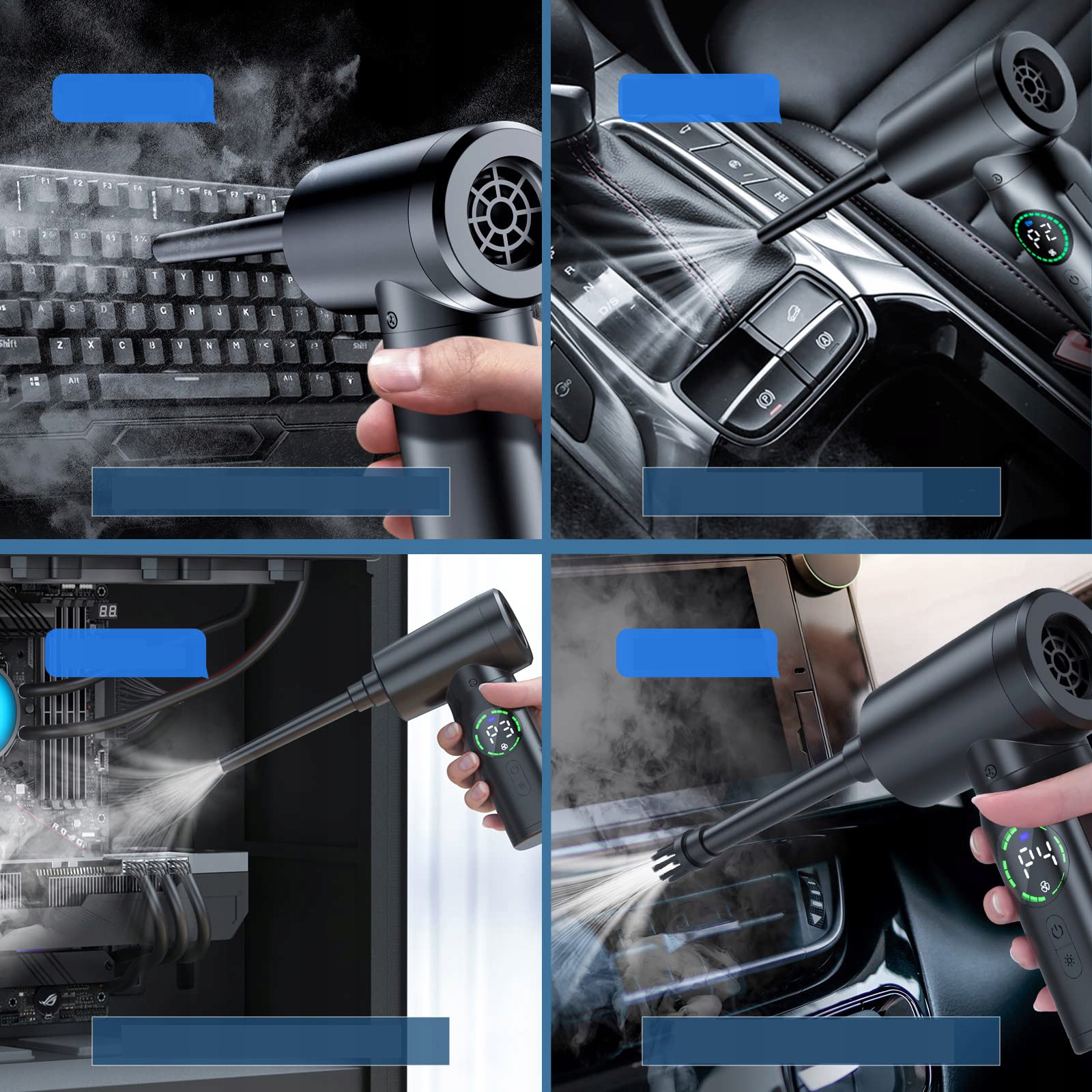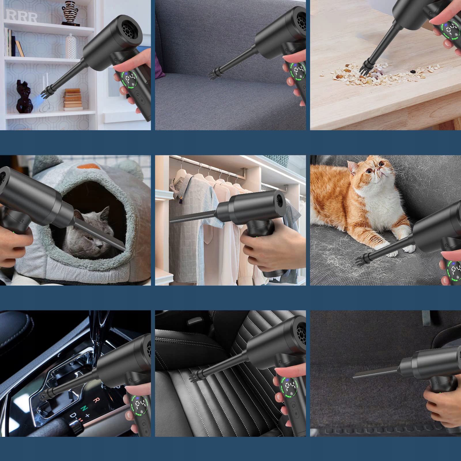 Air Duster также работает как пылесос. Передняя часть пылесоса выдувает пыль, а задняя часть пылесоса выдувает пыль. Различные насадки и щетки удовлетворяют разные потребности в чистке клавиатуры, объективов фотоаппаратов, оконных перекладин, а также надувании надувных кроватей, подушек безопасности и плавательных кругов.