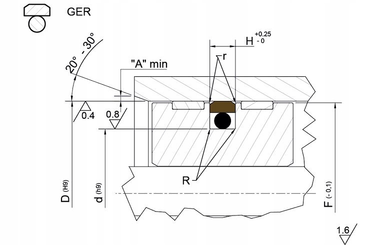 GER поршневое уплотнение двойного действия, двухэлементное. Он состоит из кольца (PTFE+бронза) и уплотнительного кольца (NBR) в качестве прижимного элемента. Обладает отличными герметизирующими свойствами и высокой устойчивостью к износу и коррозии.