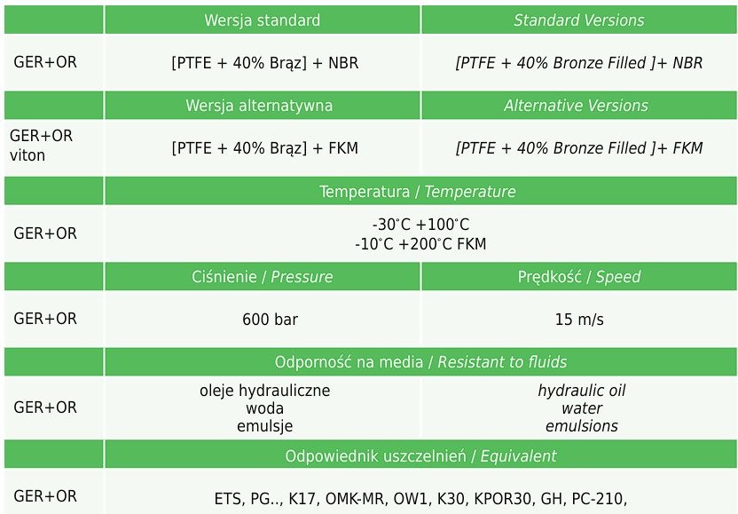 - Материал: [ПТФЭ + 40 % бронзы] + NBR; альтернативная версия: [PTFE + 40% бронза] + FKM