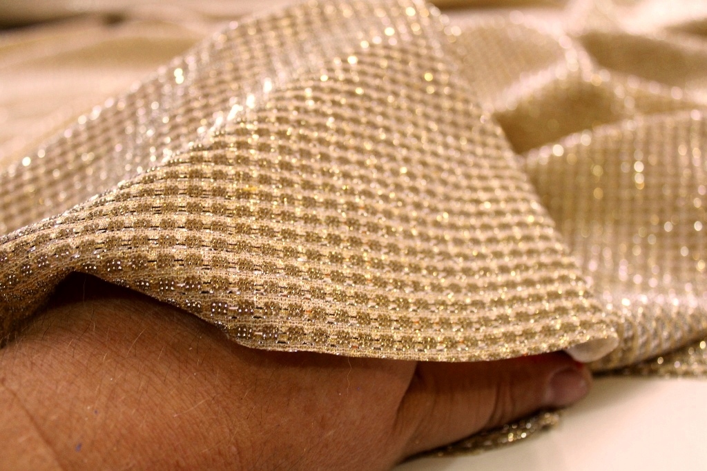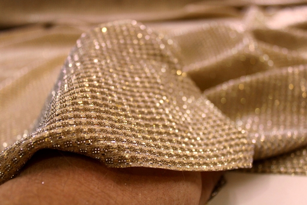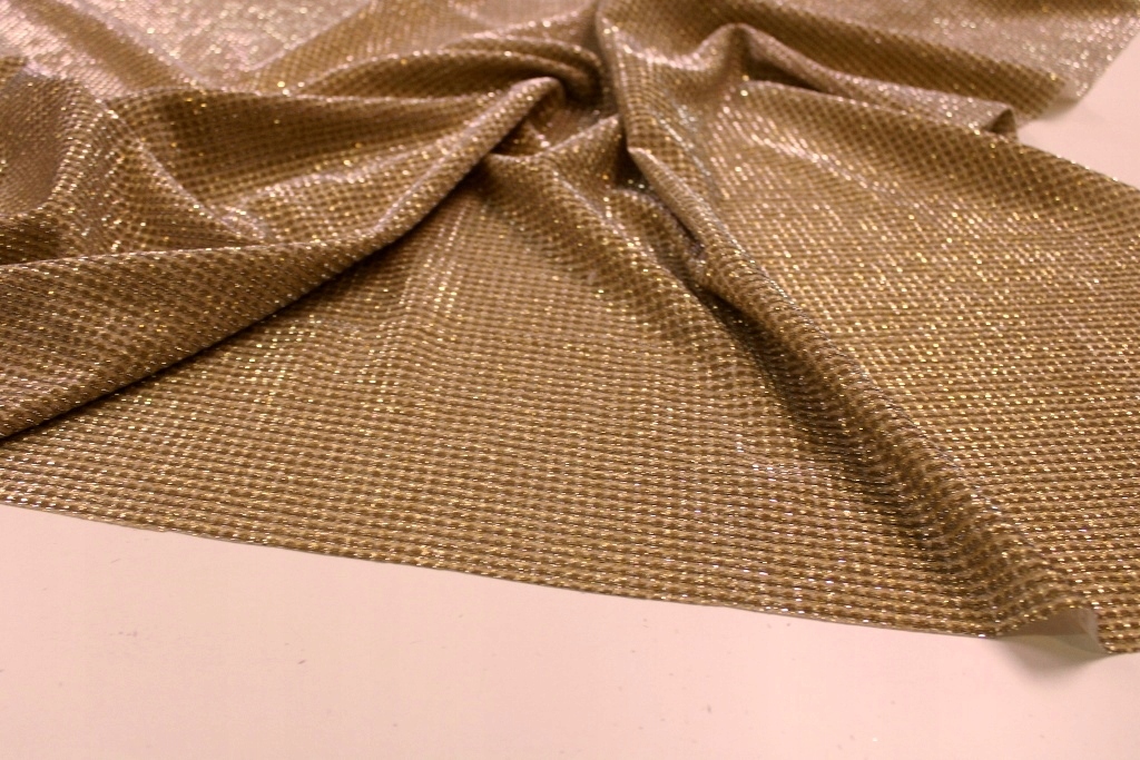 Описание: r эластичная ширина, не -концентратор, не требует подкладки, левые слайды, структурные права. Нить Lurex, парчка, вплетенная в трикотажную ткань