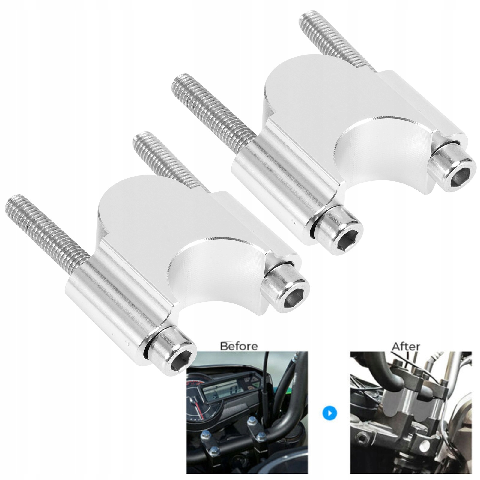 1.Высококачественный материал из алюминиевого сплава, устойчивый к ржавчине, ржавчине и долговечности. 2. Помогает водителю сохранять положение на дороге и за ее пределами, практично в использовании. 3. Широкое применение, универсально подходит для любого руля диаметром 7/8 дюйма и диаметром 30 мм. 4. Простота установки, не требуется никаких сложных инструментов, удобно в использовании. 5. Оригинальный стандарт, прямая замена старого или сломанного.