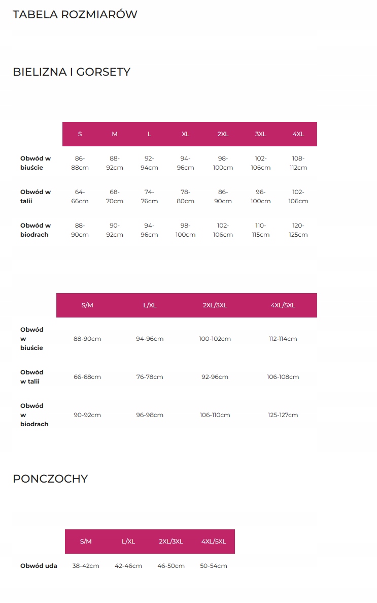 Нижнее белье 7heaven предлагается в четырех европейских размерах S, M, L, XL, а также некоторые изделия в размерах для женщин больших размеров, например 2XL, 3XL, 4XL.