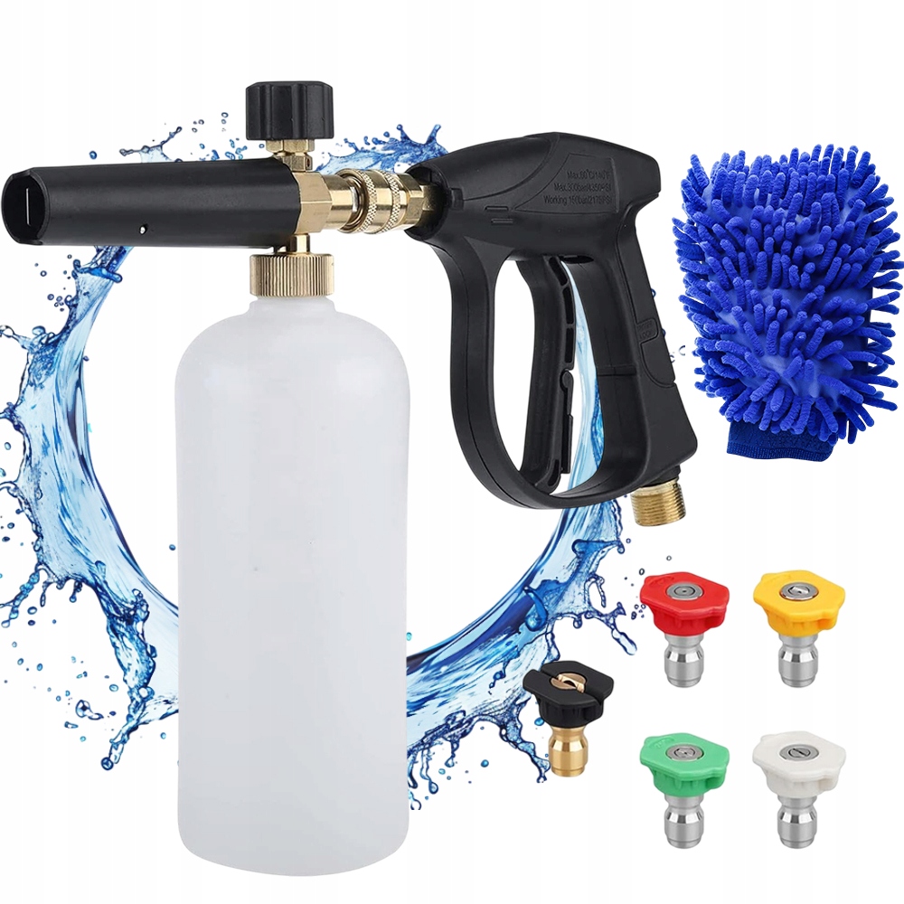 - 5 насадок в наборе пистолетов для пены под высоким давлением могут создавать различные углы мытья, которые очень подходят для очистки различных поверхностей, таких как автомобили, стены и окна. Чистящие перчатки помогут быстро вытереть воду.