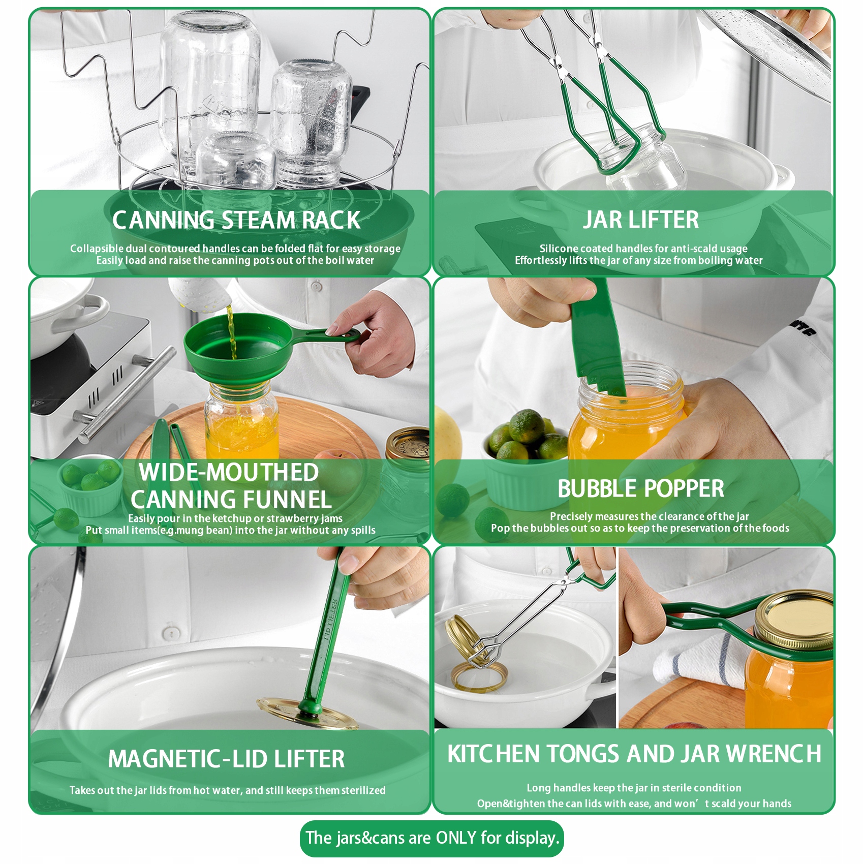 - Вы получите: до 7 BC. 1 * набор для консервирования, 1 * банка для подъема, 1 * ключ для банок, 1 * кухонные шампуры, 1 * лопатка для пузырьков, 1 * подъемник для крышек, 1 * подставка для консервирования.