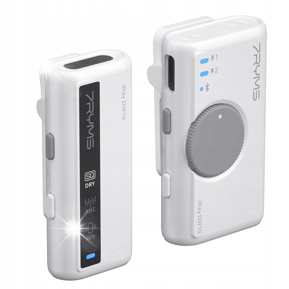 7Ryms iRay DW10 — компактный беспроводной микрофон, предназначенный для работы со смартфонами, компьютерами, а также фотоаппаратами и видеокамерами. В комплект входит приемник с портами USB-C и мини-джек 3,5 мм и передатчик со встроенным микрофоном. Устройства работают на частоте 2,4 ГГц — соединяются друг с другом по беспроводной сети на расстоянии до 100 м (без препятствий на местности). Передача характеризуется малой задержкой <20 мс.
