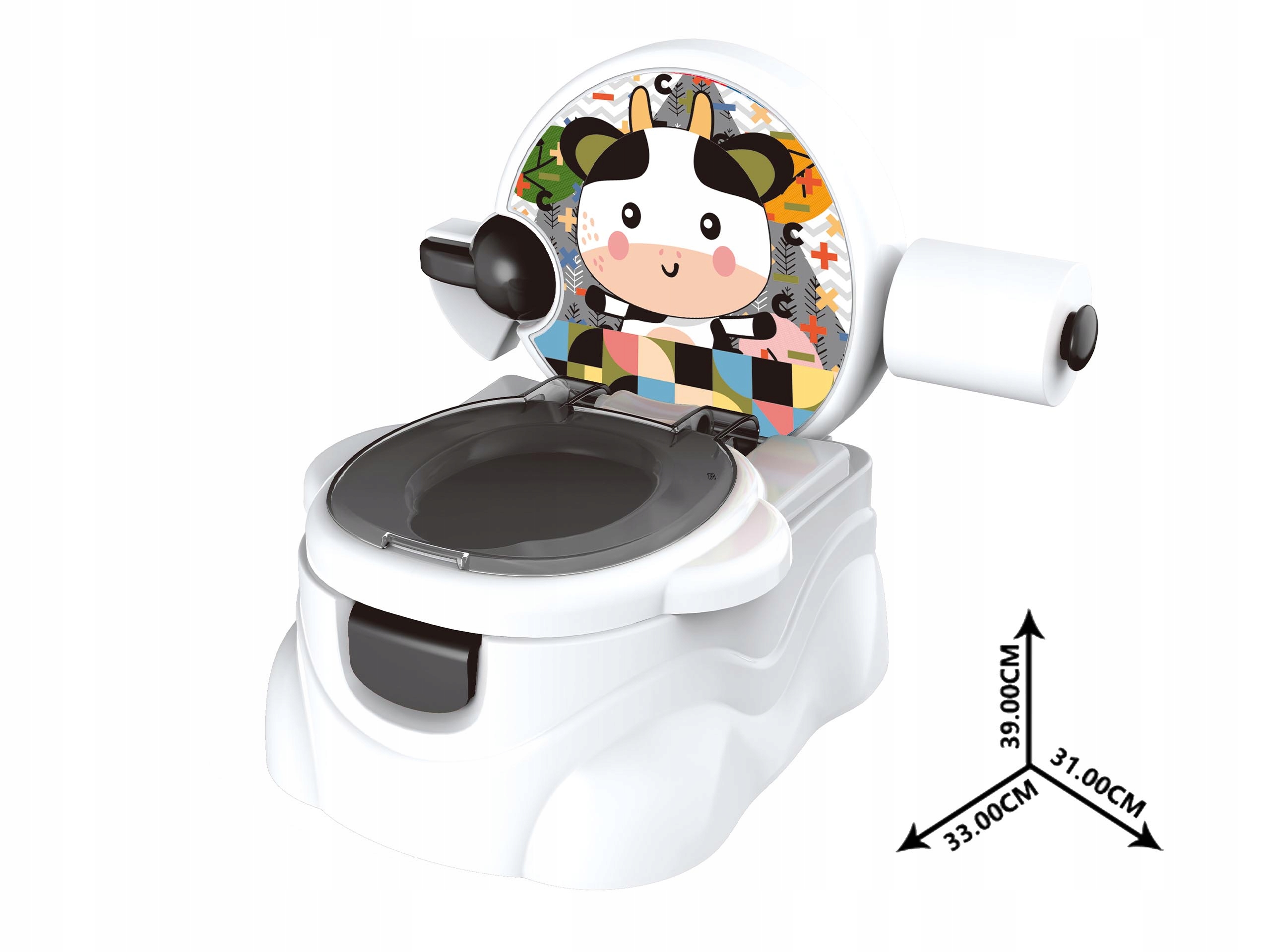 Белый и черный цвет / модель Krówka / Горшок 7 в 1 - Стул - Подставка для ног - Сиденье - Смыв - Держатель для бумаги - Музыка