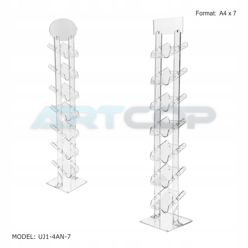 Отдельная подставка - бесплатный - Free Leaflets Feeder для листовок или рекламных папок в вертикальном формате A4, изготовленном из бесцветного плексигласа 4 мм и 8 мм с общей высотой 185 см. Стенд имеет 7 полков, в которых могут быть размещены 7 различных папок или листовок для клиентов. Подставка, предназначенная для сложенного, делает его очень мобильным. Вы можете распространить его в детали и сложить в любом месте. Стенд может быть доставлен пассажирским автомобилем, что делает его идеальным для рыночных выставок, презентаций, чтений и конференций. Он одинаково хорошо работает в офисах компании, обменных офисах, туристических агентствах, магазинах, бутиках, аптеках и во многих других местах. Для индивидуальных потребностей и идентификации компании используется вершина, на которой вы можете разместить свой торговый знак или название продукта, с которым относятся листочки или папки. В ногах есть отверстия, которые позволяют вам изменить положение полок в четырех положениях. Полки могут быть наклонены более или менее вертикально, как более удобно. Это означает, что операция этой модели эффективна. Даже фотографии не могут показать свои преимущества и эстетику. Ярмарка и выставка. Каждый продукт разработан с точки зрения дизайна, функциональности и выносливости