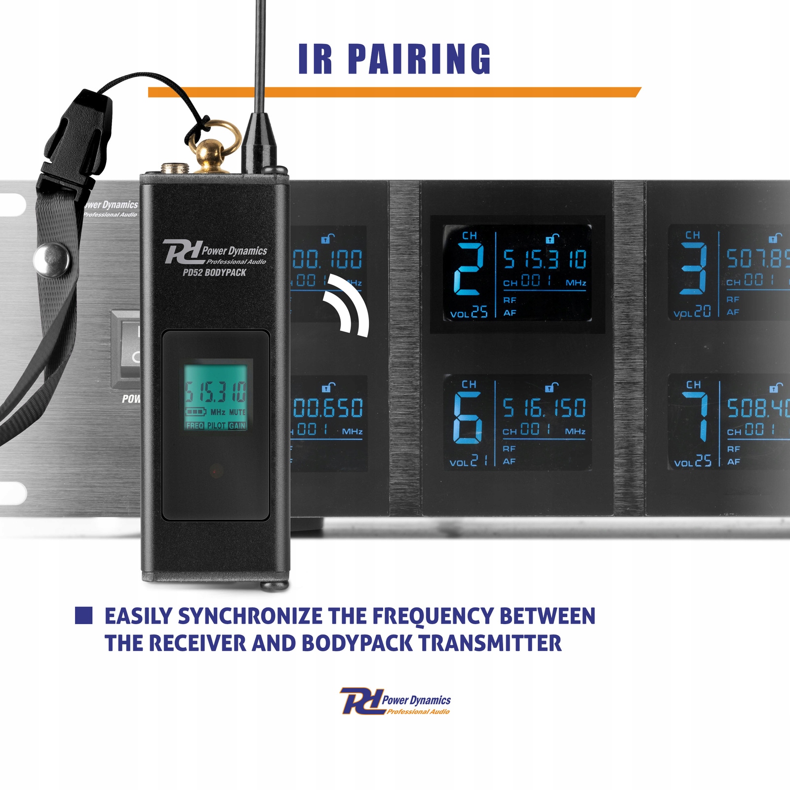 В микрофонной системе Power Dynamics PD528B этот набор обеспечивает простую синхронизацию частот между приемником и поясным передатчиком. Просто поднесите устройства ближе друг к другу, чтобы автоматически установить нужный канал — быстро, удобно и без необходимости ручной настройки.