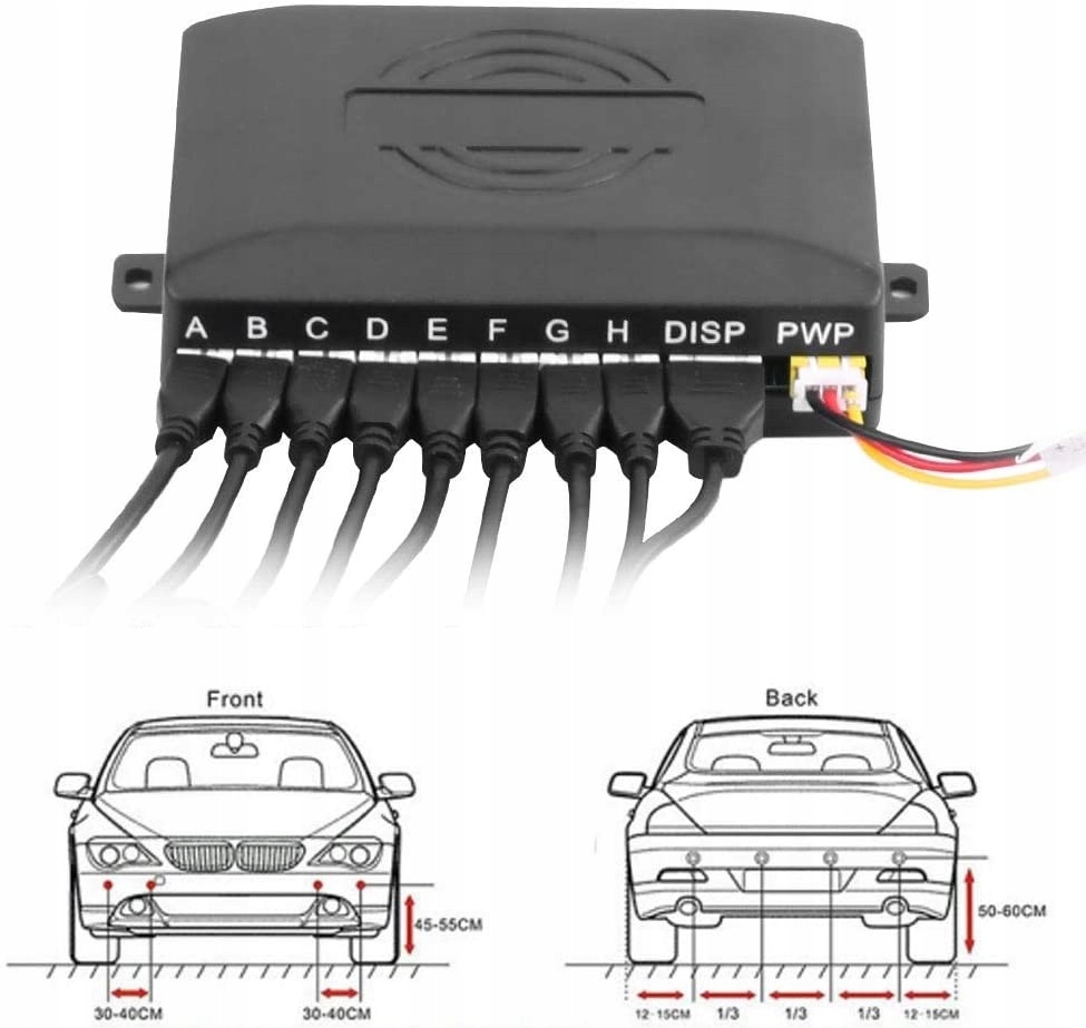 - 8 датчиков, размещенных в бампере с длинными кабелями для подключения к центральному блоку. Цвет ЧЕРНЫЙ.