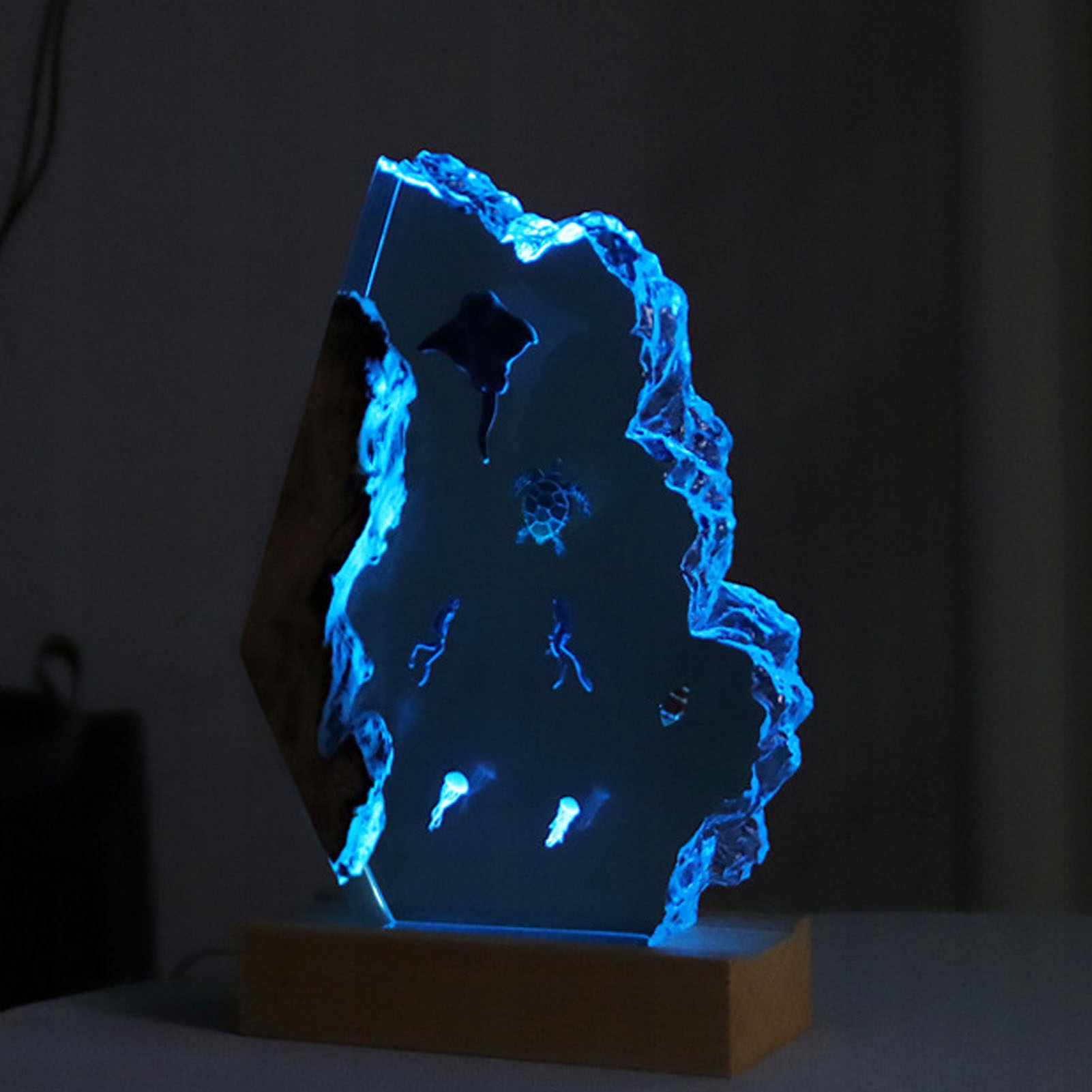 2. Материал: прозрачный материал, изготовленный из смолы, создает драматический эффект переплетения трехмерного и полого, реального и виртуального. Светодиодные фонари крепятся внутри держателя лампы с помощью USB-кабеля. Ночью этот загадочный маленький подводный мир излучает мягкий свет.
