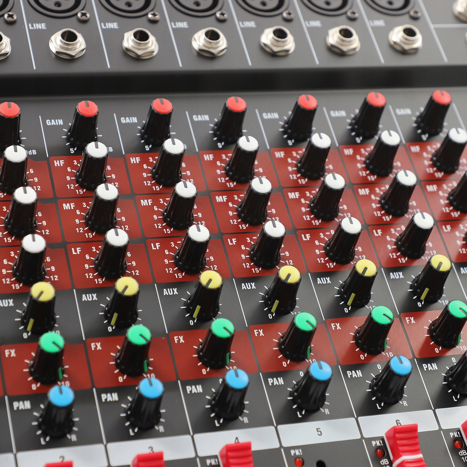 - Точный контроль: Каждый канал оснащен независимыми ручками регулировки усиления и высокой, средней и низкой частоты, которые могут точно регулировать качество звука каждого источника звука. 2,48-дюймовые красные фейдеры используются для регулировки выходного уровня каждого канала для точного регулирования громкости каждого источника звука.
