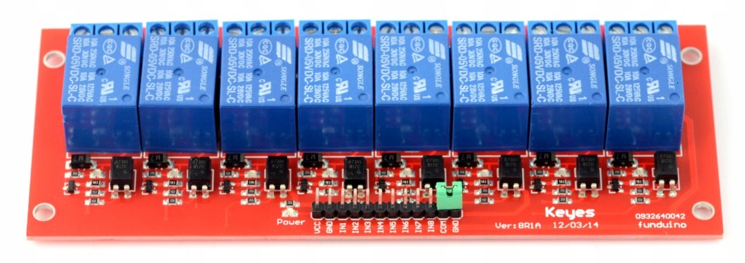 Модуль оснащен восемью реле SRD-05 с катушкой с питанием 5 В и оптоэлектронной изоляцией. Система позволяет управлять исполнительными механизмами с помощью портов микроконтроллера или любого комплекта разработки.