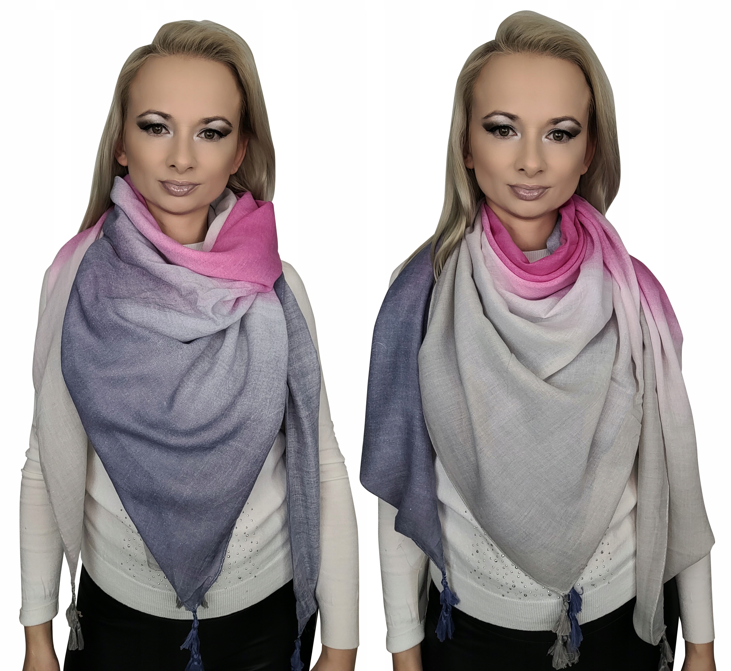 Красивые большие шарфы в стиле бохо с бахромой с узором омбре. Каждый шарф имеет свой уникальный узор омбре, состоящий из переплетения трех цветов. Благодаря этому шарф может полностью меняться в зависимости от того, как его носить.