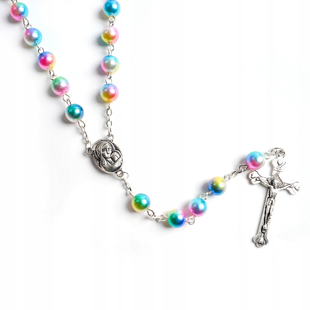 Акриловой Розарий, радужный розарий с медалью, содержащей часть Святой Земли, является уникальным предметом молитвы и прекрасного религиозного сувенира. бусинки с диаметром 8 мм в ярких цветах радуги привлекла глаз, добавляя радостный персонаж в четки. Медаль с частью Святой Земли придает ей особую духовную и символическую ценность. Розарий легкий, удобный в использовании и идеально подходит как подарок, сувенир или для ежедневной молитвы.